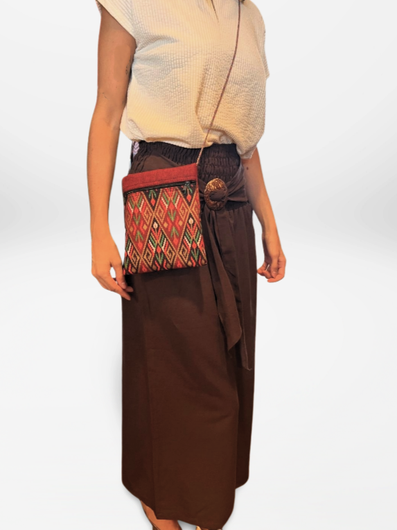 Bandolera hecha a mano con un diseño rombos y motivos tribales en tonos rojos, verdes y beige, este bolso refleja la esencia más auténtica de los tejidos de Isan. Su franja superior burdeos aporta armonía al conjunto. Un accesorio ideal para quienes buscan color y personalidad en su día a día.