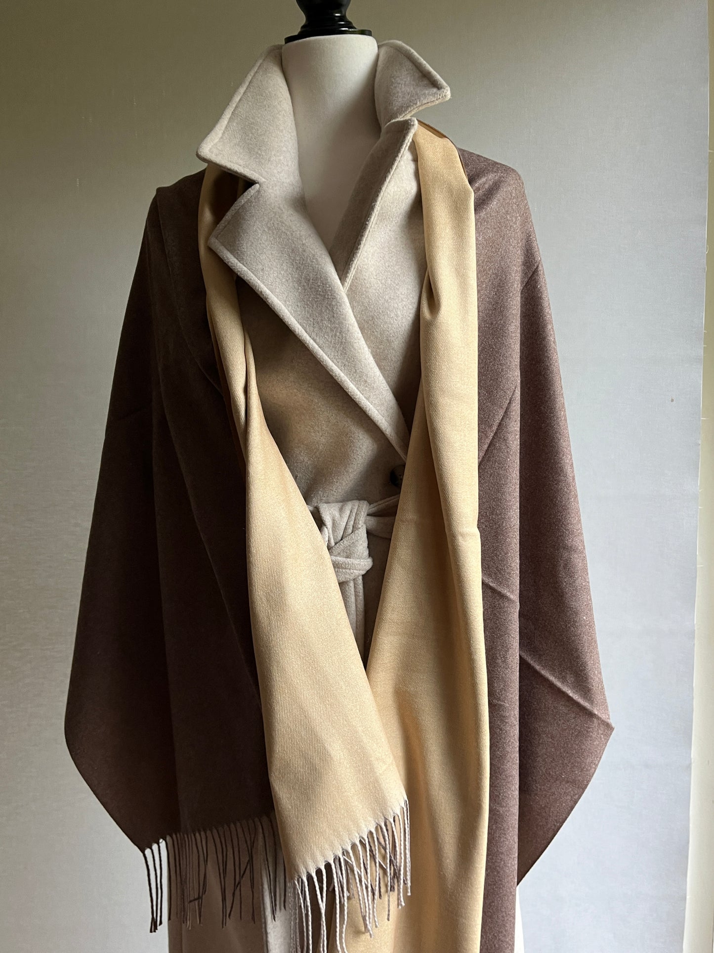 Elegante y versátil, esta bufanda bicolor color marrón oscuro y beige y, confeccionada en Tailandia combina estilo, calidad y comodidad. Reversible y con un tacto extremadamente suave y cálido, es ideal para los meses de invierno, aportando no solo protección contra el frío, sino también un toque de sofisticación. Su diseño de doble cara, realzado con delicados flecos, y su generoso tamaño permiten usarla como chal, capa o pashmina, adaptándose fácilmente a cualquier ocasión.