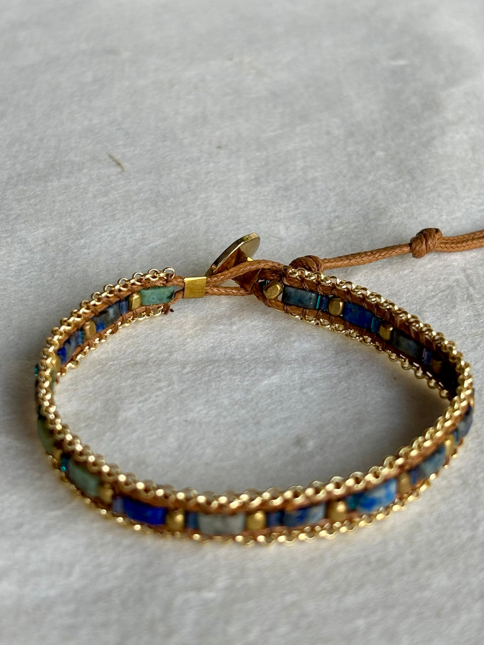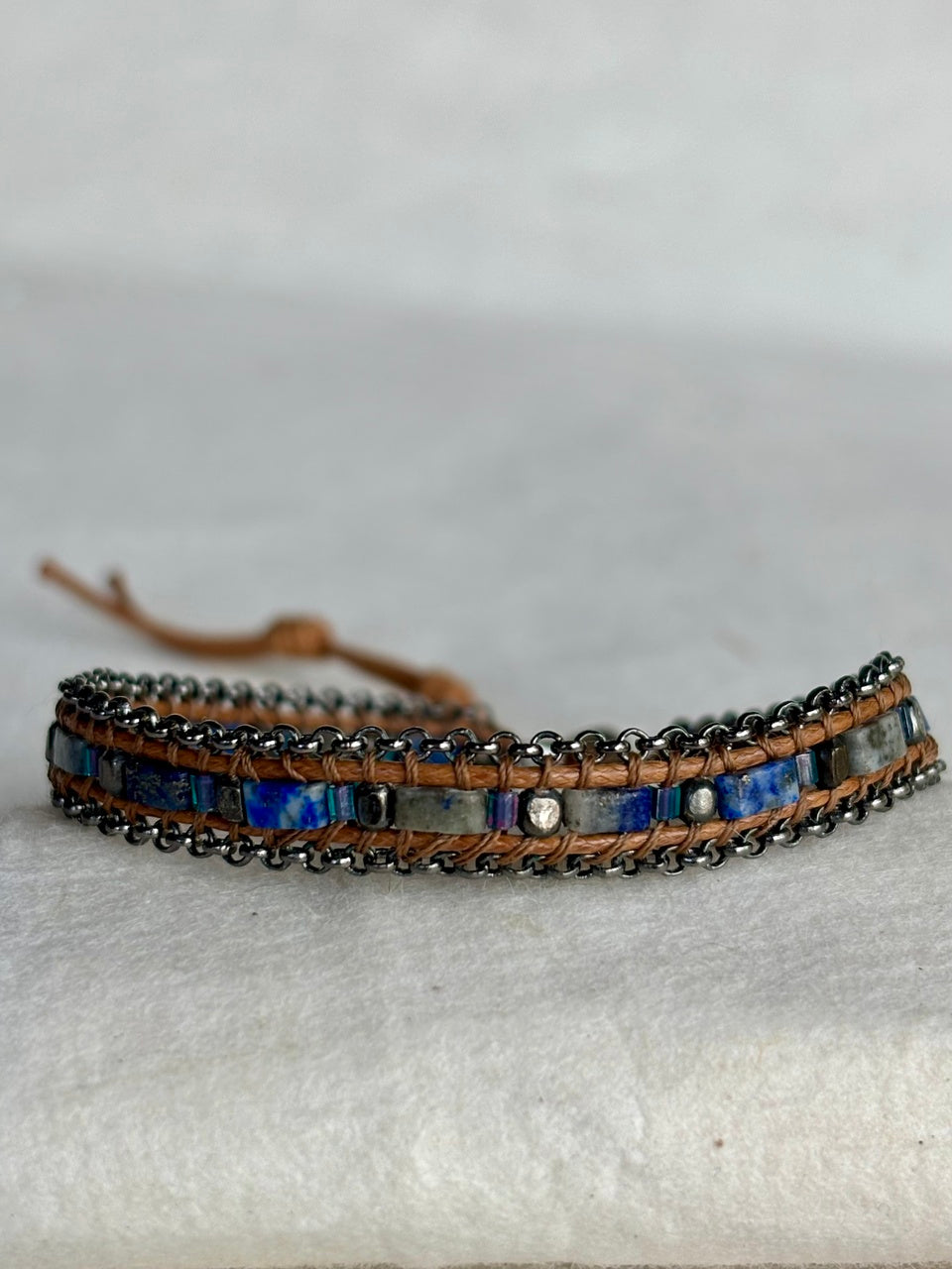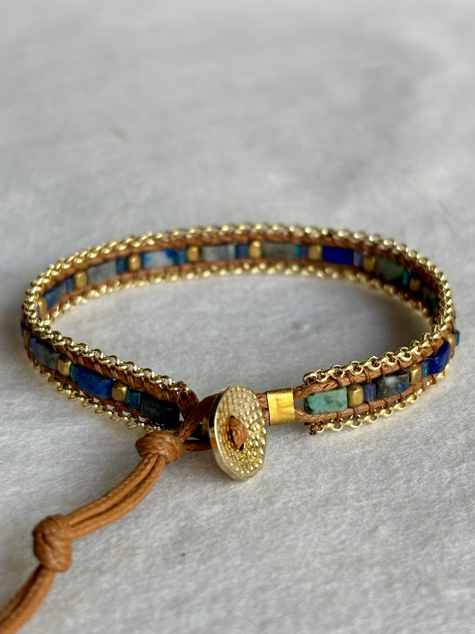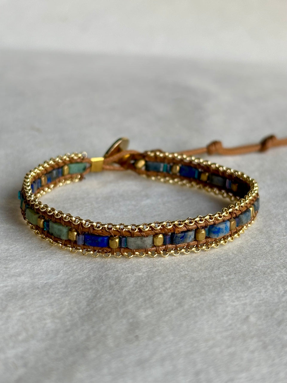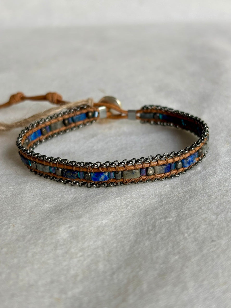 Pulsera elaborada a mano en Tailandia, con un diseño contemporáneo y elegante que combina una fila central de piedras naturales y cuentas de cristal, acompañadas de pequeños detalles metálicos, cuidadosamente entrelazadas sobre cordón trenzado. El conjunto se enmarca con una fina cadena metálica decorativa que aporta estructura y un acabado sofisticado. Incorpora un cierre ajustable mediante nudos corredizos, que permite adaptarse cómodamente a diferentes tallas de muñeca.