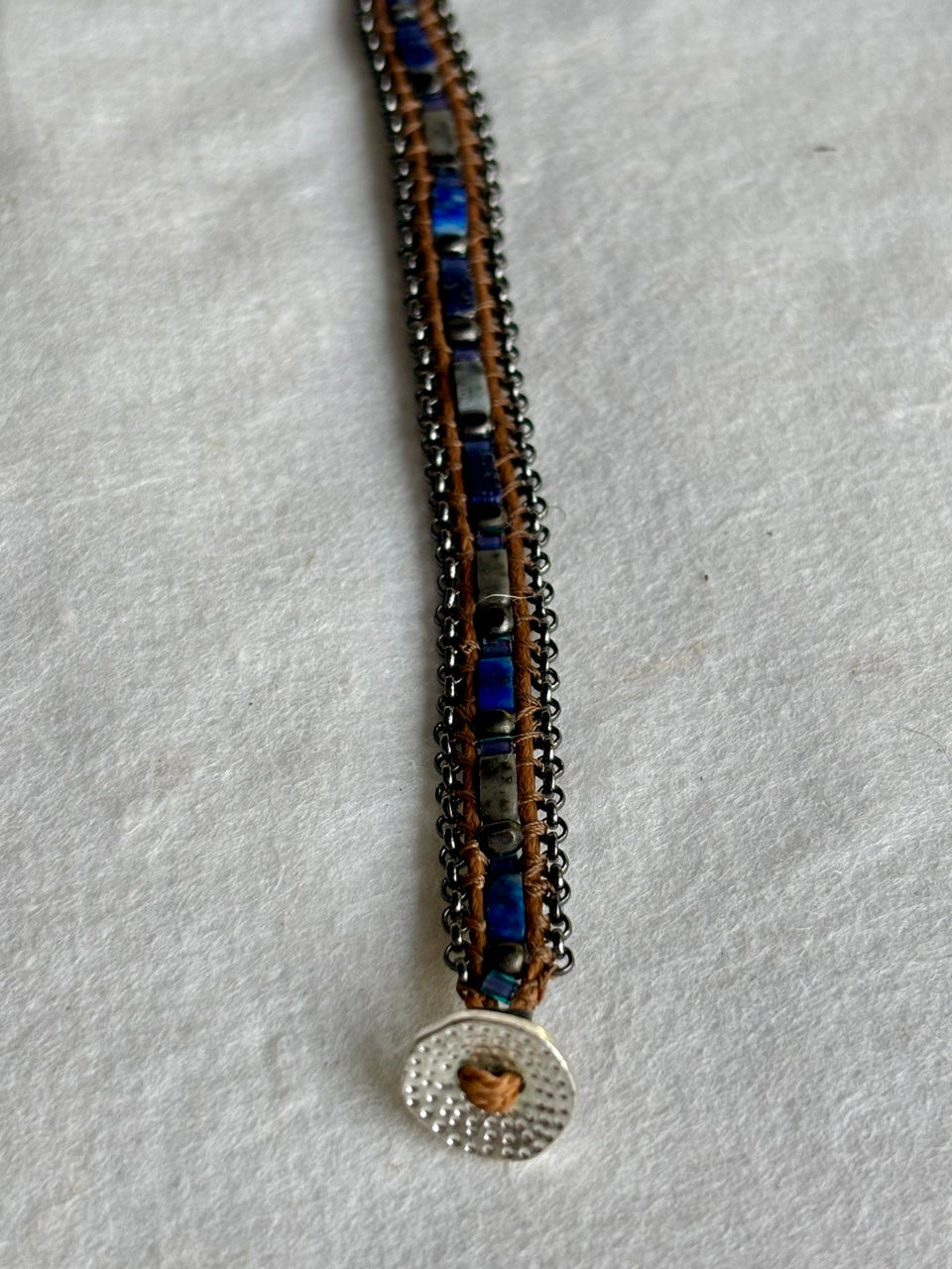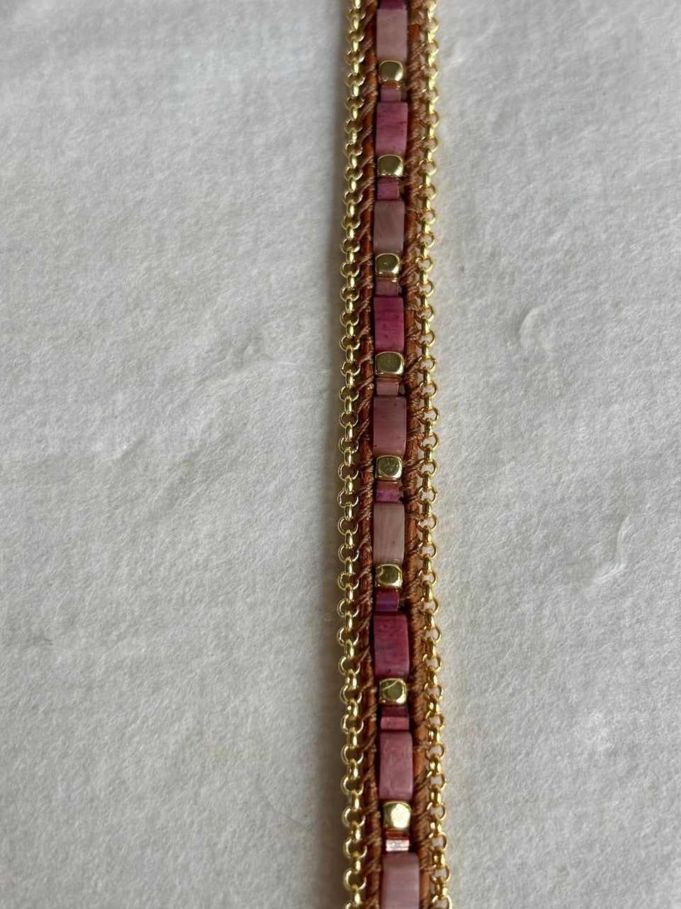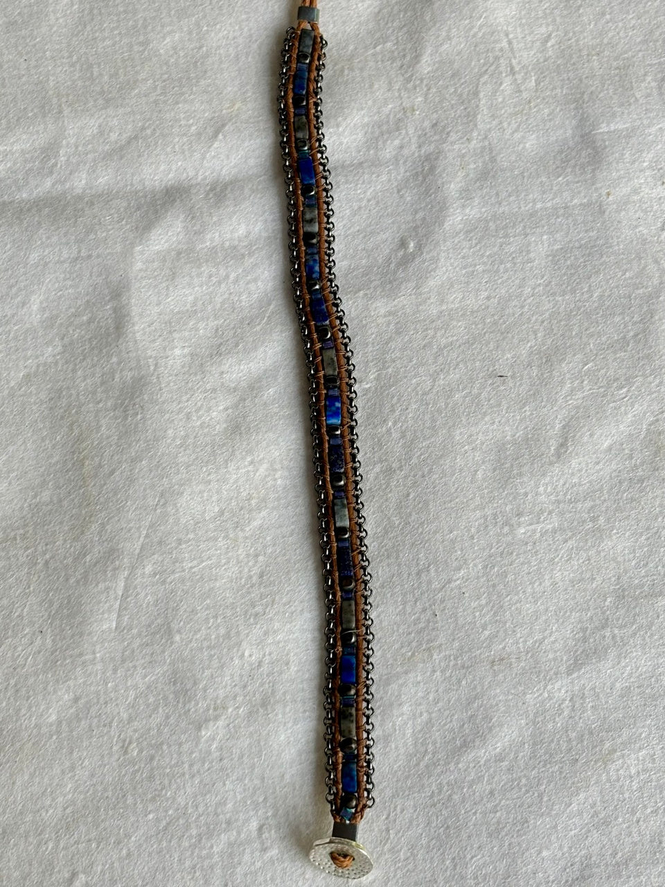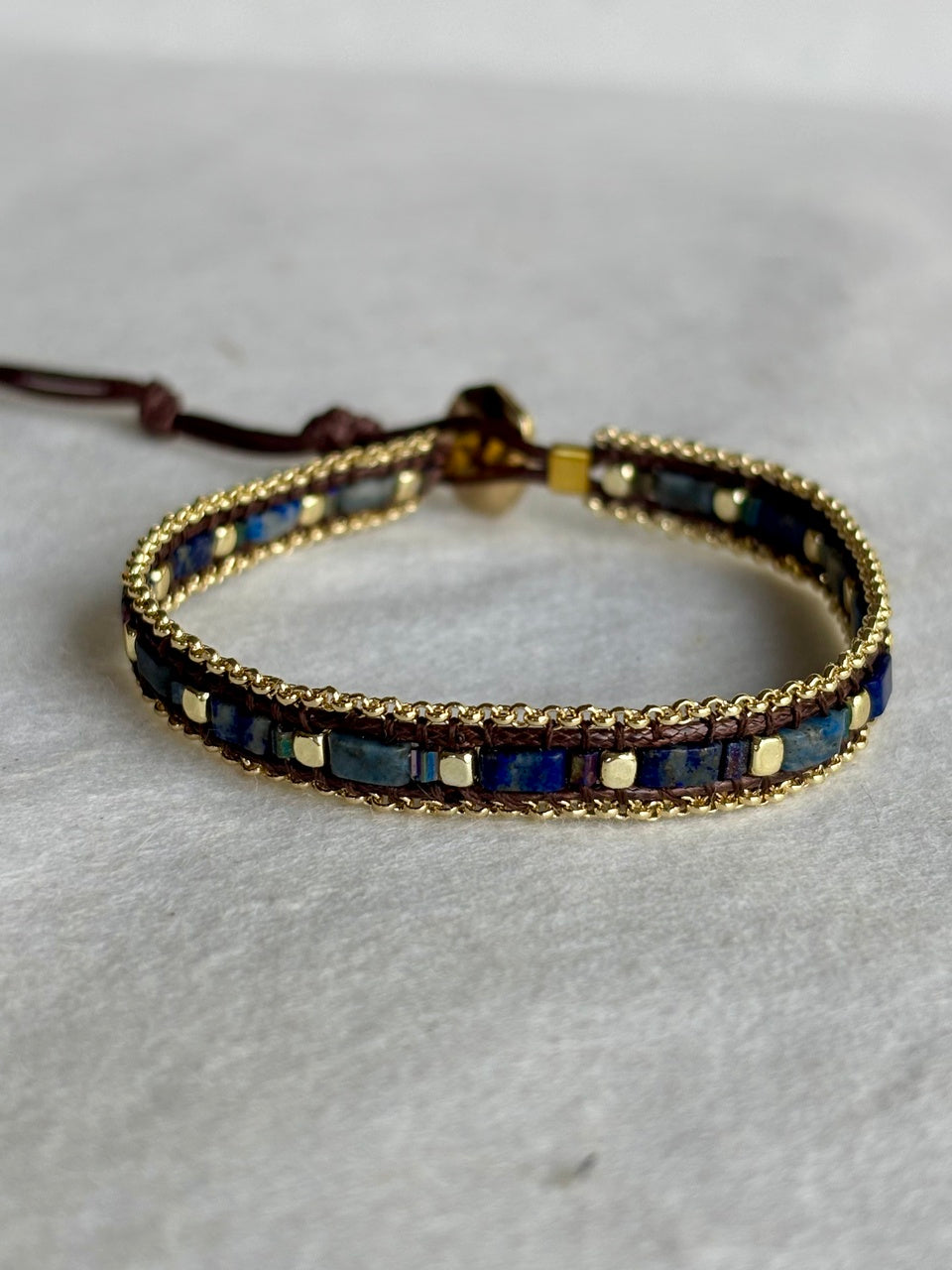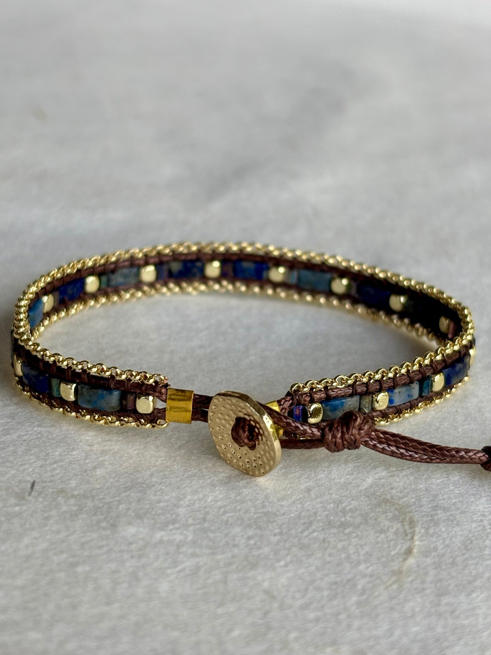 Pulsera elaborada a mano en Tailandia, con un diseño contemporáneo y elegante que combina una fila central de piedras naturales y cuentas de cristal, acompañadas de pequeños detalles metálicos, cuidadosamente entrelazadas sobre cordón trenzado. El conjunto se enmarca con una fina cadena metálica decorativa que aporta estructura y un acabado sofisticado. Incorpora un cierre ajustable mediante nudos corredizos, que permite adaptarse cómodamente a diferentes tallas de muñeca.
