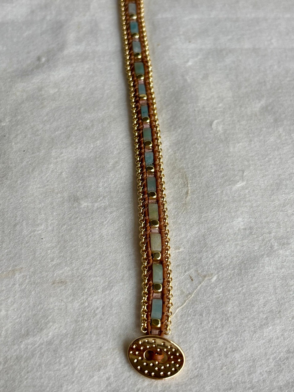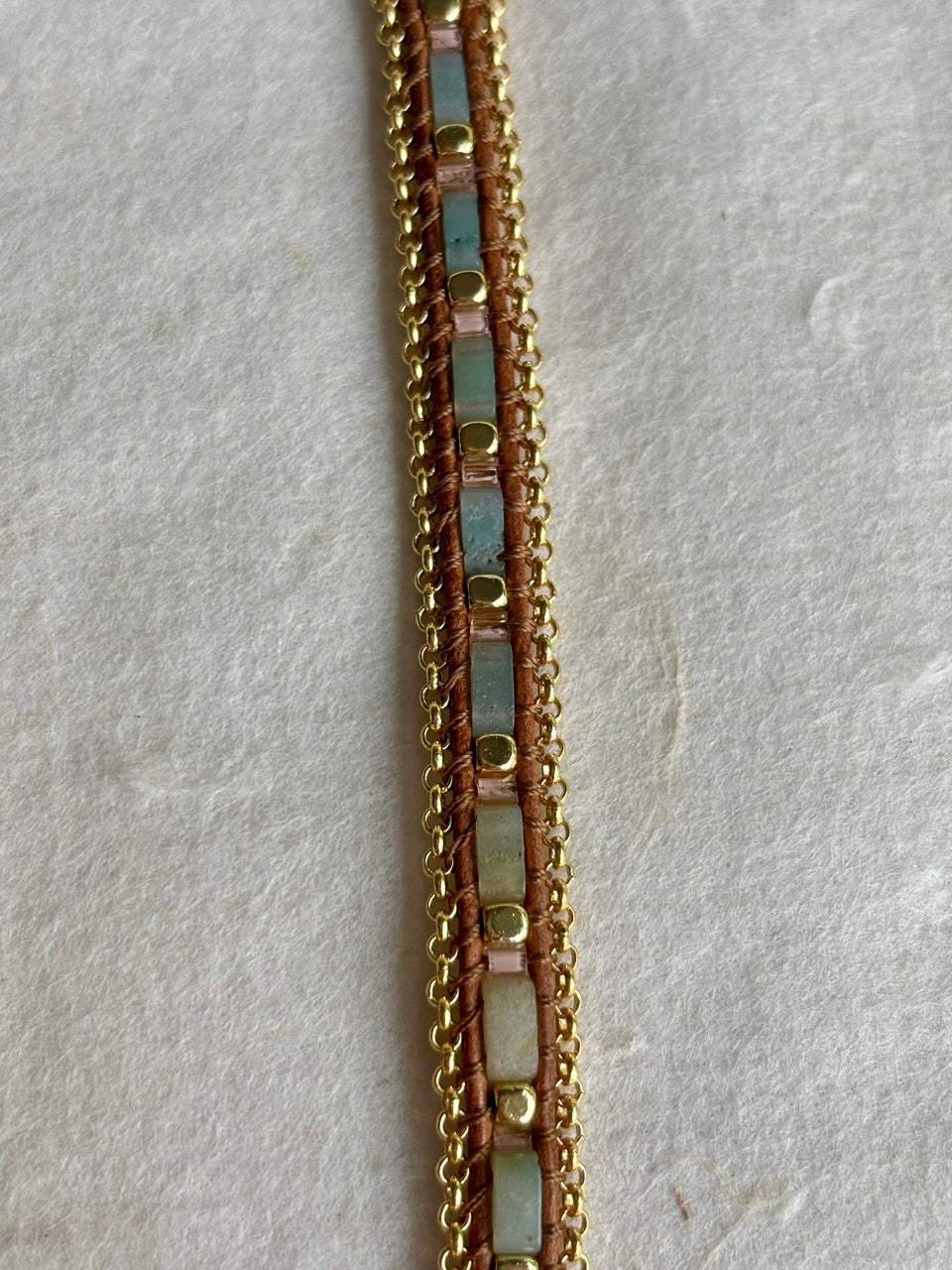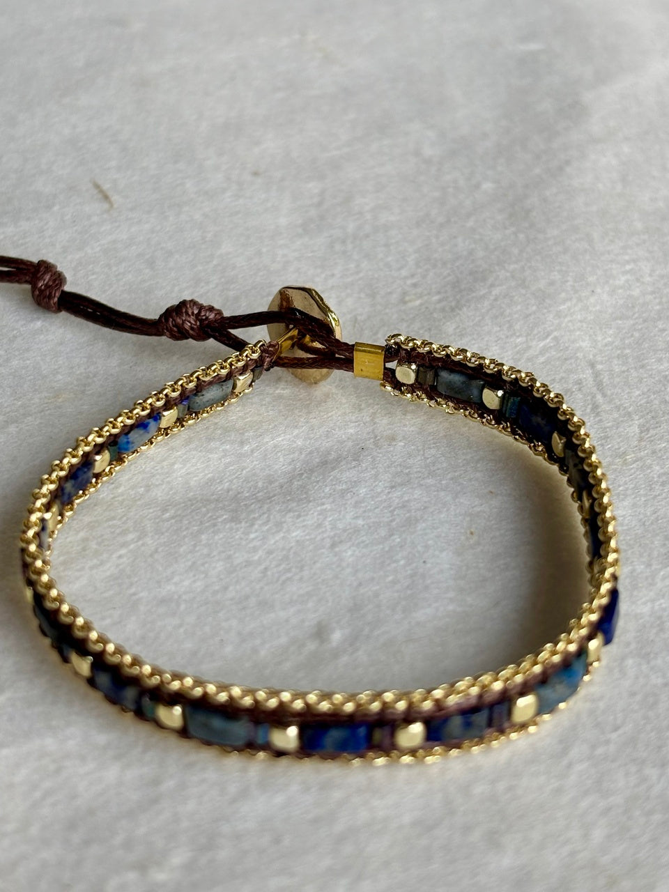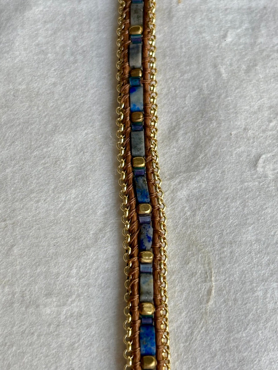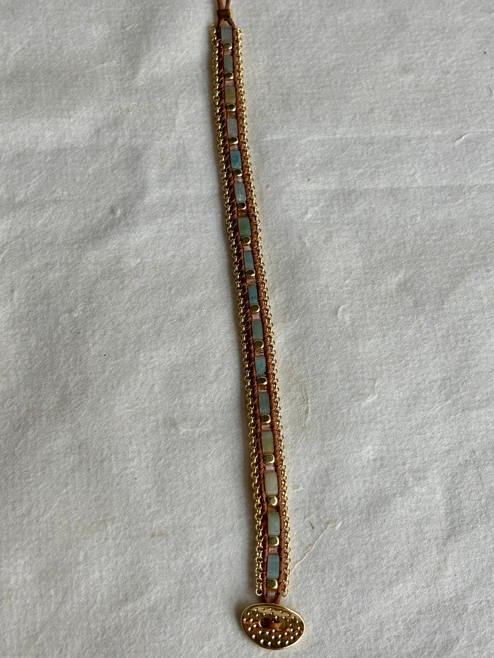 Pulsera elaborada a mano en Tailandia, con un diseño contemporáneo y elegante que combina una fila central de piedras naturales y cuentas de cristal, acompañadas de pequeños detalles metálicos, cuidadosamente entrelazadas sobre cordón trenzado. El conjunto se enmarca con una fina cadena metálica decorativa que aporta estructura y un acabado sofisticado. Incorpora un cierre ajustable mediante nudos corredizos, que permite adaptarse cómodamente a diferentes tallas de muñeca.