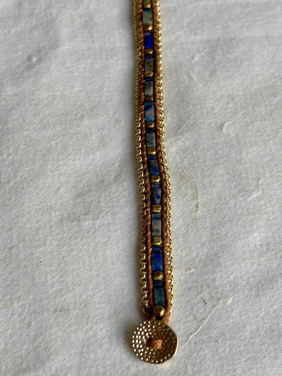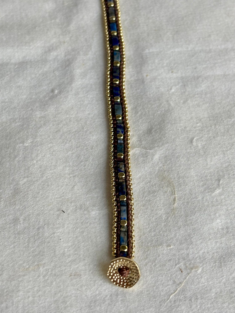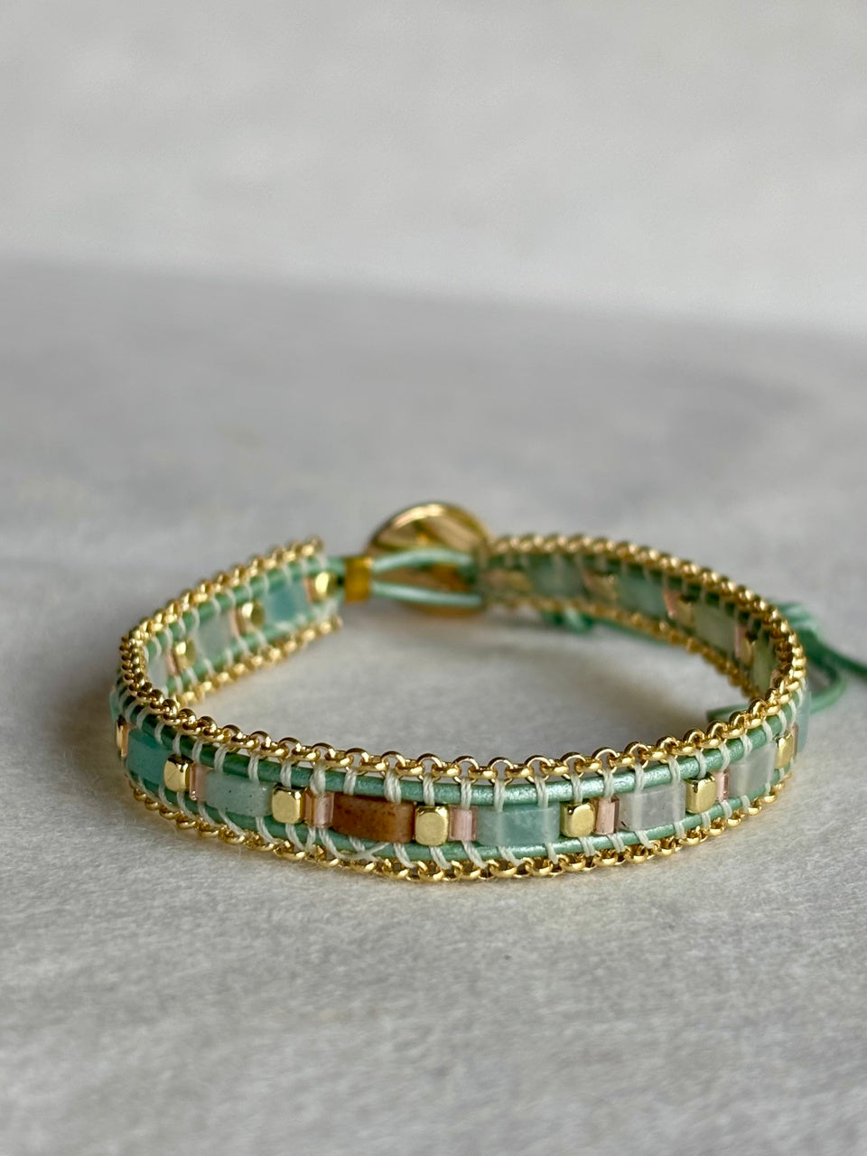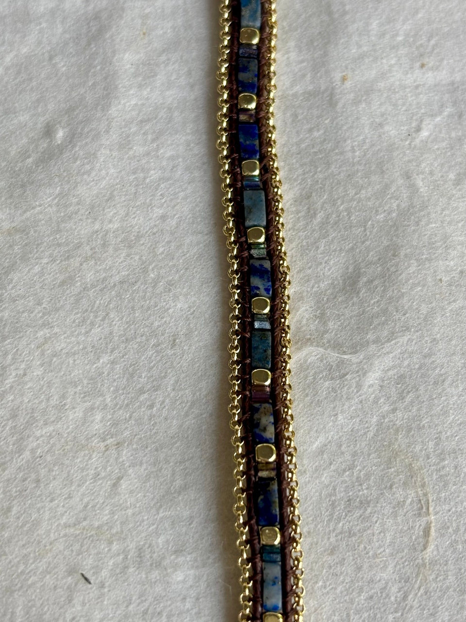 Pulsera elaborada a mano en Tailandia, con un diseño contemporáneo y elegante que combina una fila central de piedras naturales y cuentas de cristal, acompañadas de pequeños detalles metálicos, cuidadosamente entrelazadas sobre cordón trenzado. El conjunto se enmarca con una fina cadena metálica decorativa que aporta estructura y un acabado sofisticado. Incorpora un cierre ajustable mediante nudos corredizos, que permite adaptarse cómodamente a diferentes tallas de muñeca.