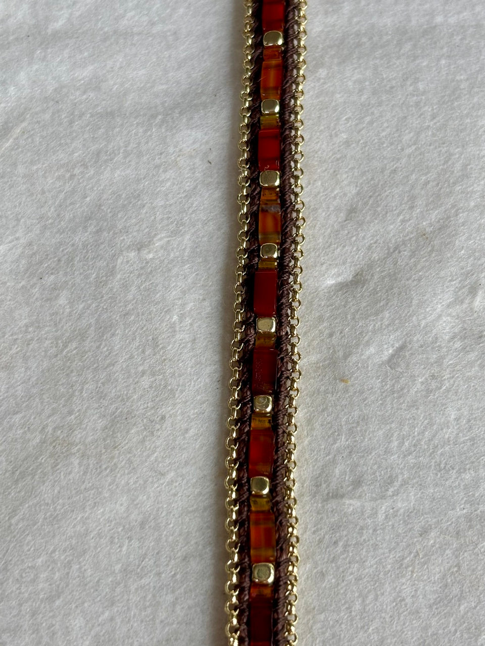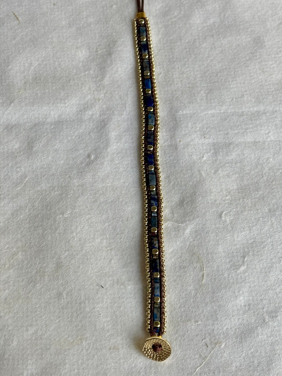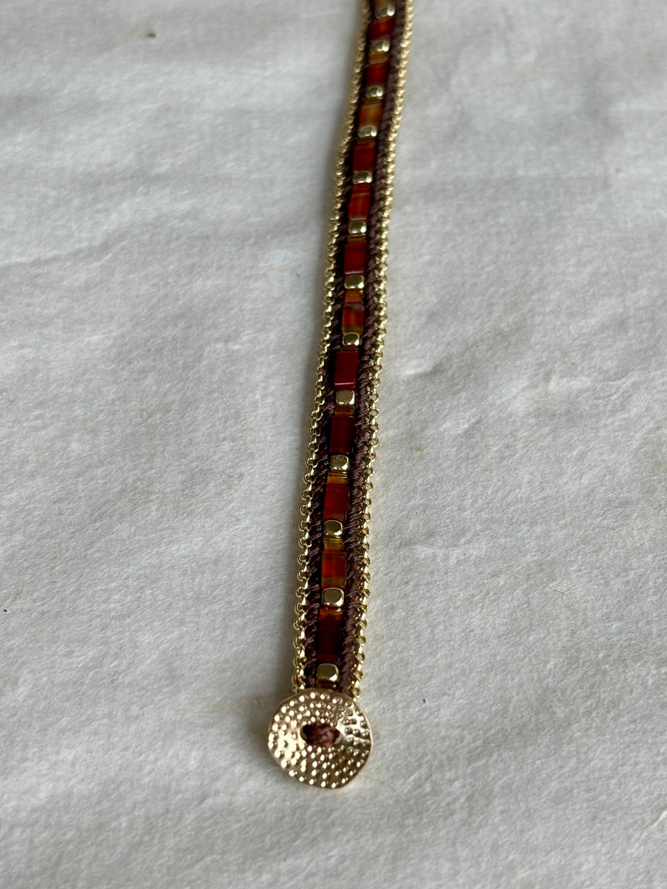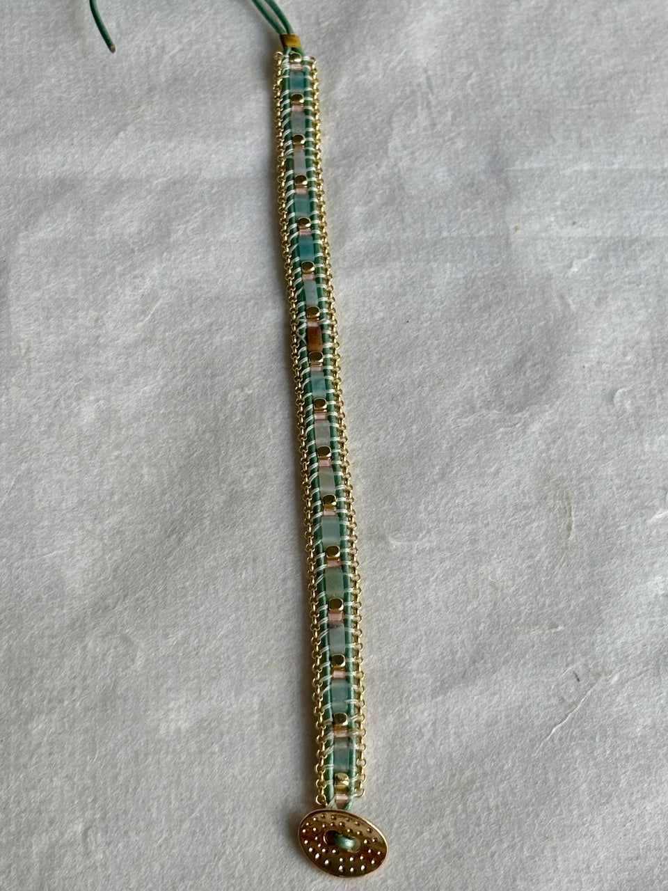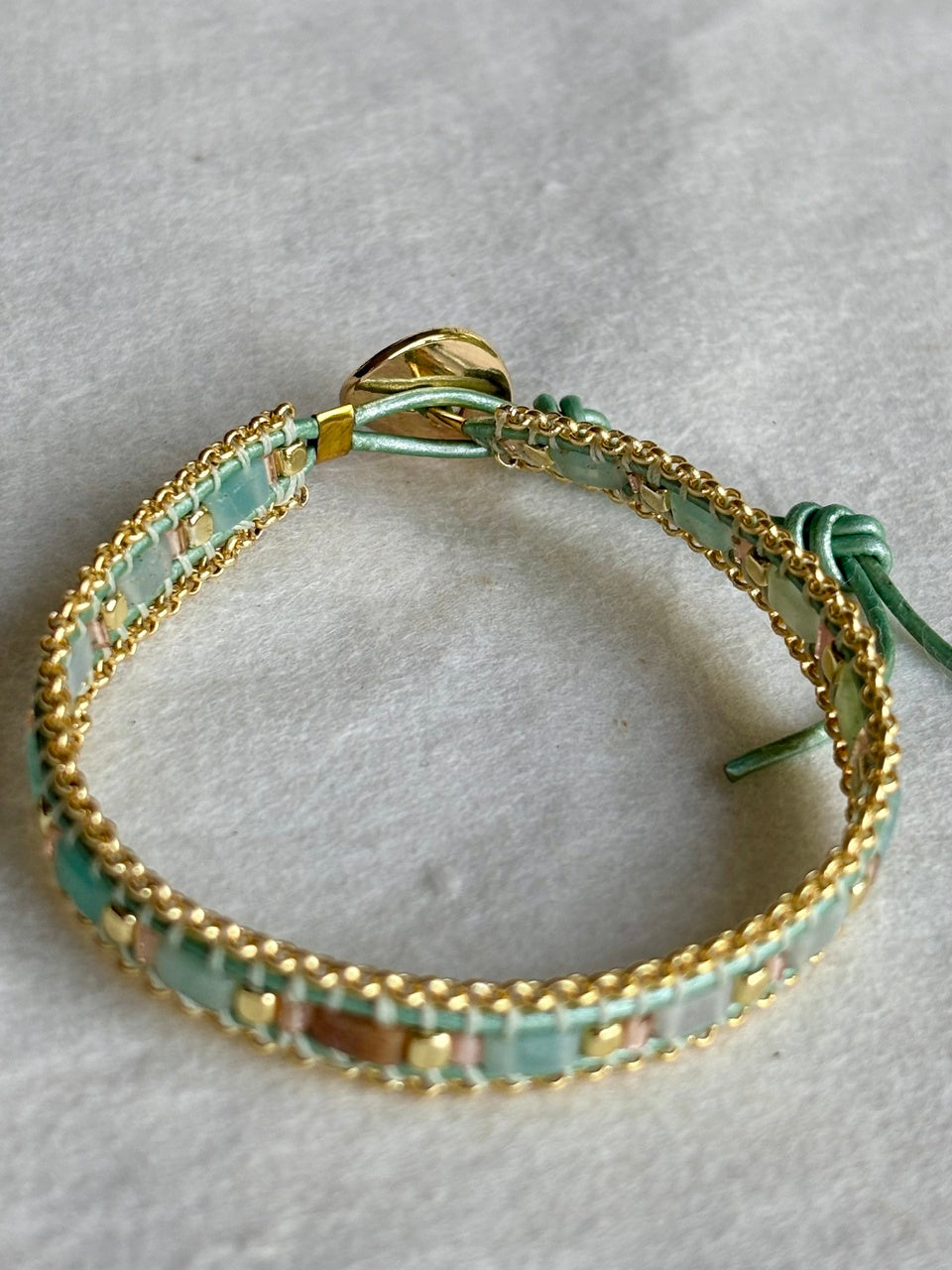 Pulsera elaborada a mano en Tailandia, con un diseño contemporáneo y elegante que combina una fila central de piedras naturales y cuentas de cristal, acompañadas de pequeños detalles metálicos, cuidadosamente entrelazadas sobre cordón trenzado. El conjunto se enmarca con una fina cadena metálica decorativa que aporta estructura y un acabado sofisticado. Incorpora un cierre ajustable mediante nudos corredizos, que permite adaptarse cómodamente a diferentes tallas de muñeca.