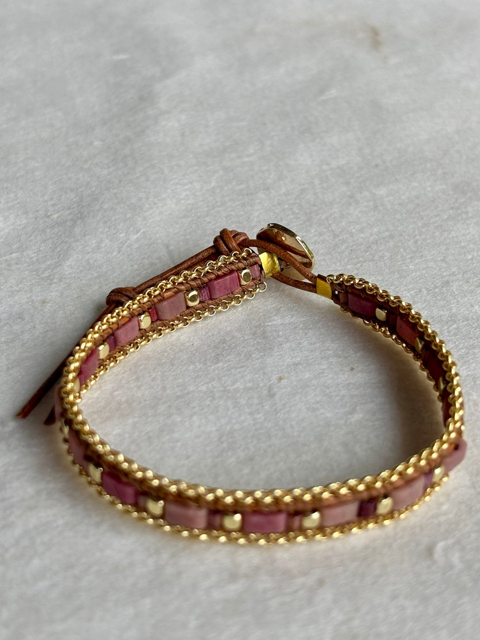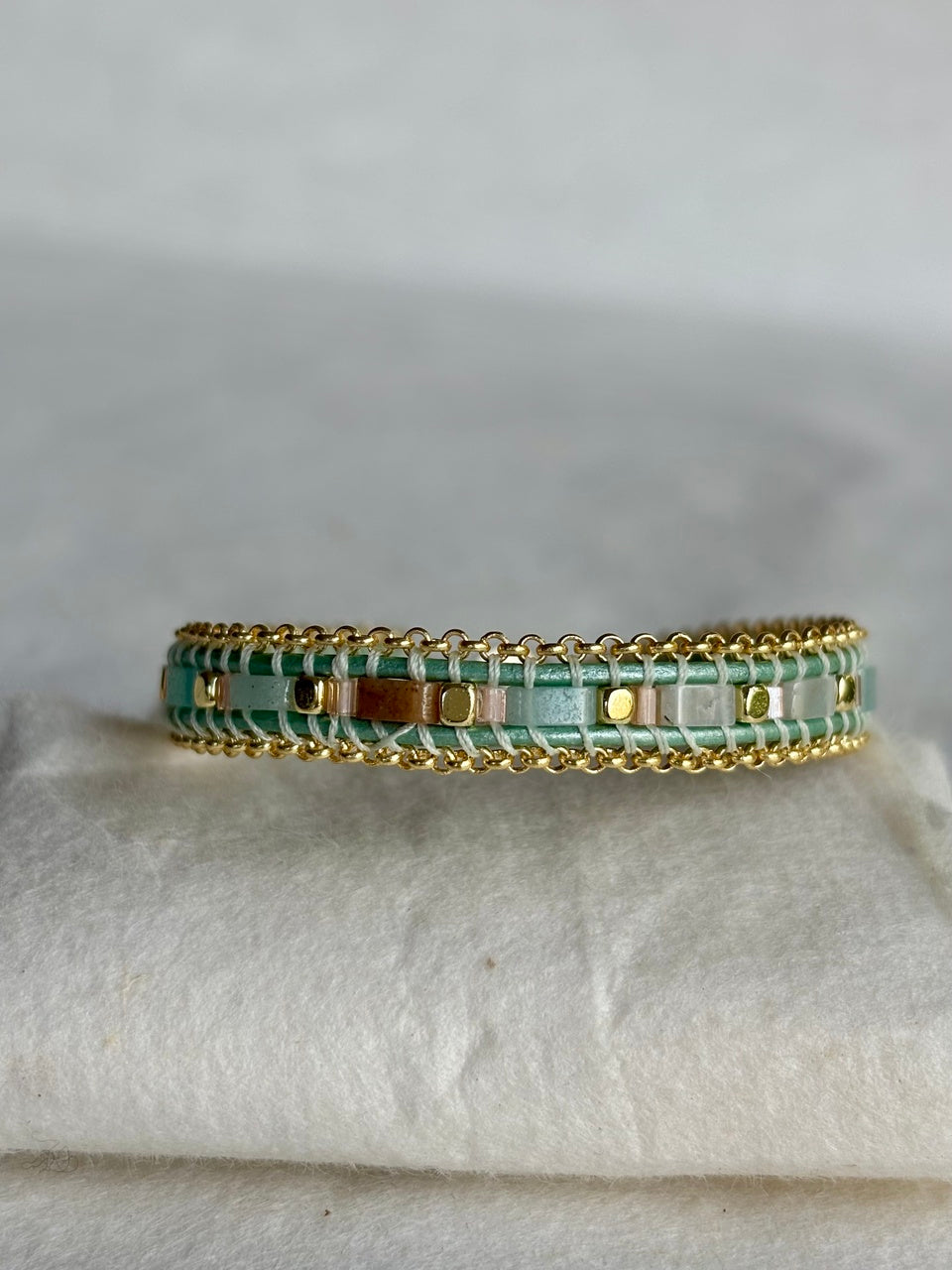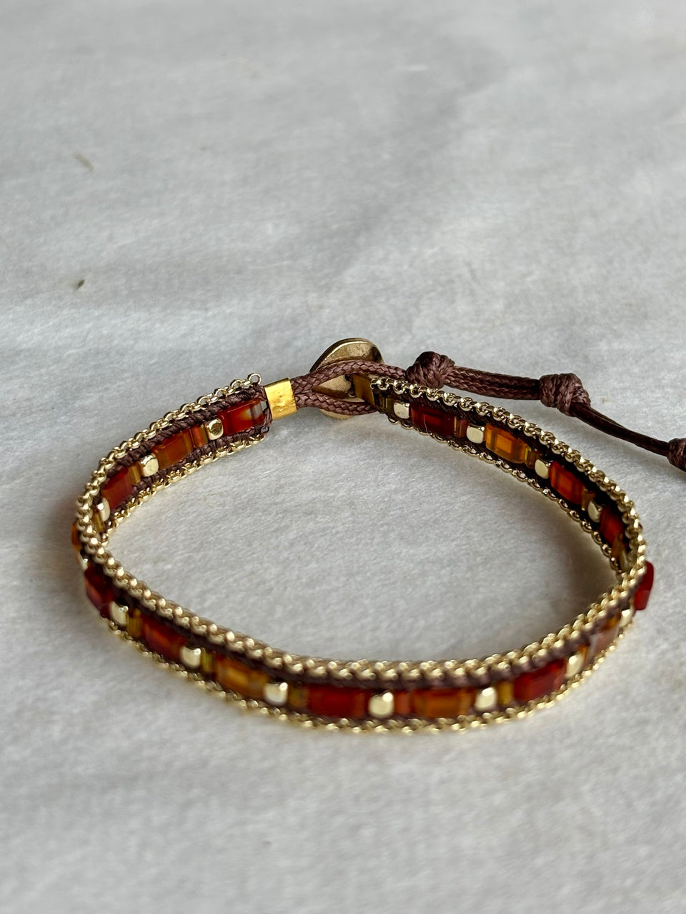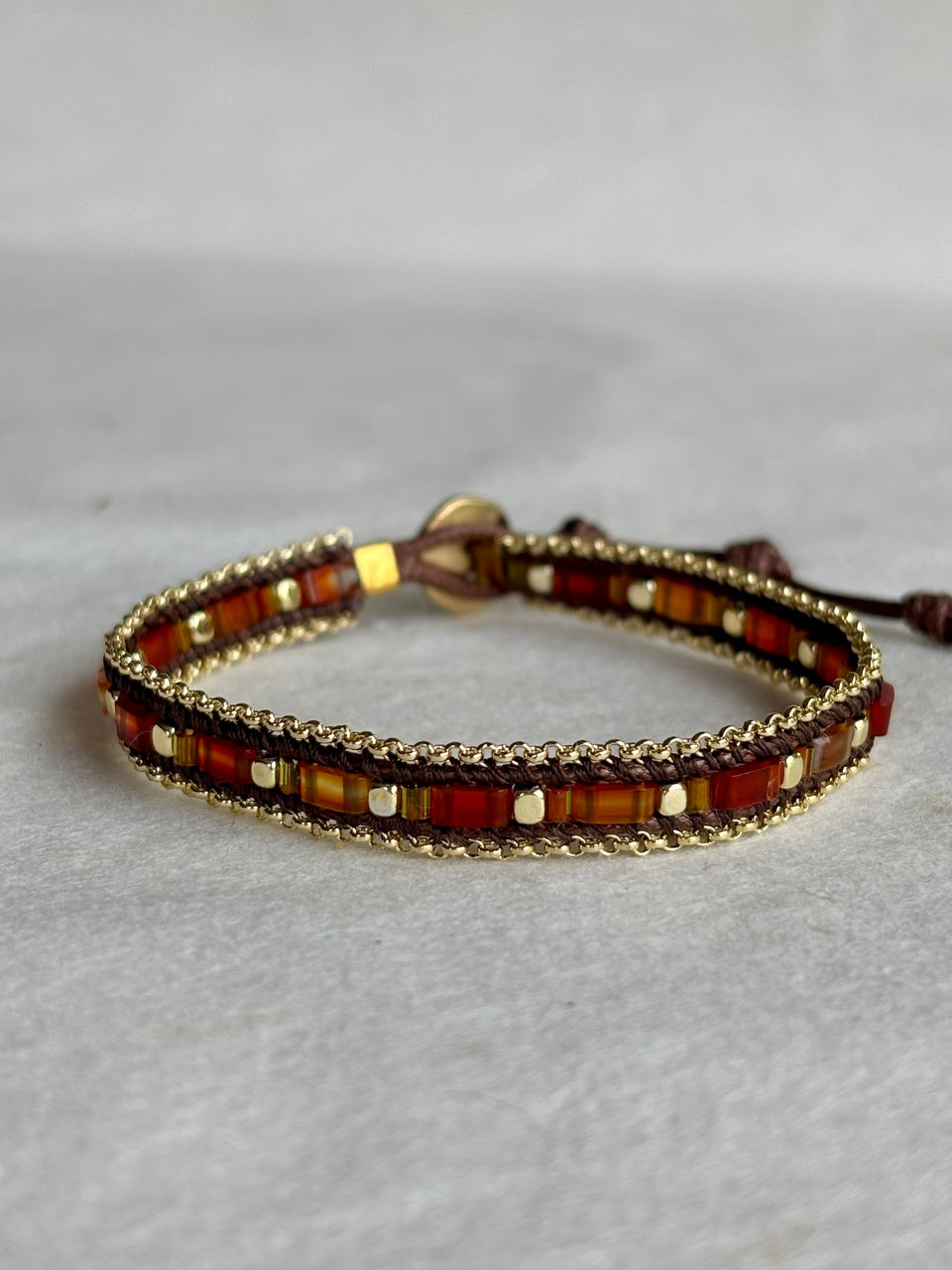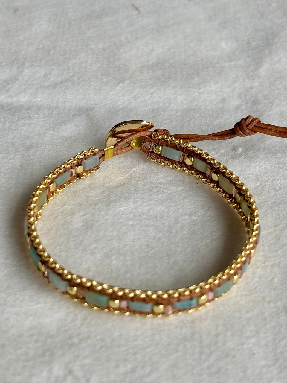 Pulsera elaborada a mano en Tailandia, con un diseño contemporáneo y elegante que combina una fila central de piedras naturales y cuentas de cristal, acompañadas de pequeños detalles metálicos, cuidadosamente entrelazadas sobre cordón trenzado. El conjunto se enmarca con una fina cadena metálica decorativa que aporta estructura y un acabado sofisticado. Incorpora un cierre ajustable mediante nudos corredizos, que permite adaptarse cómodamente a diferentes tallas de muñeca.