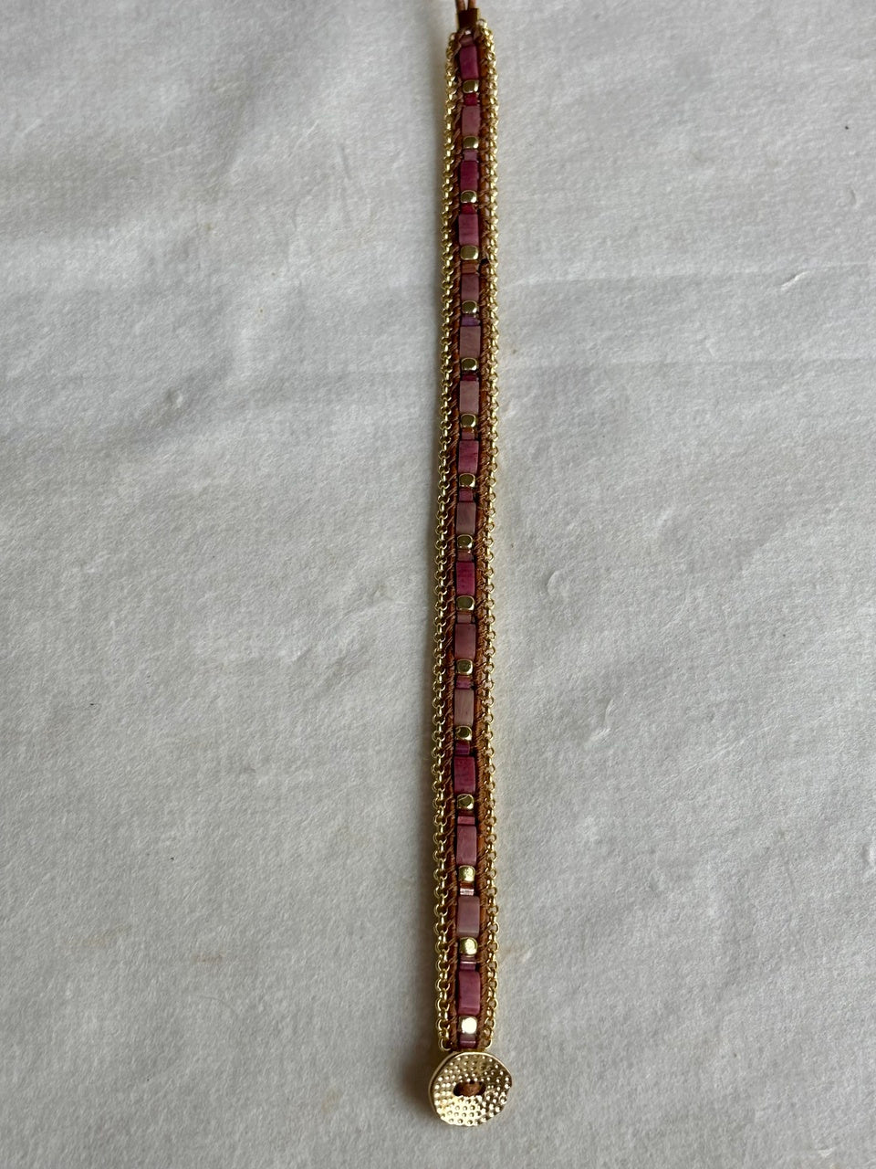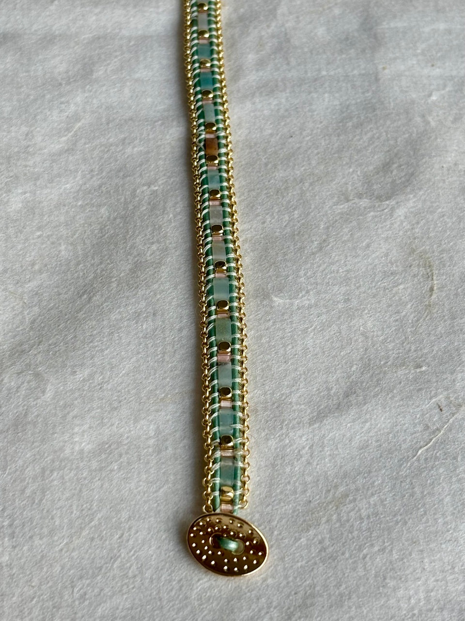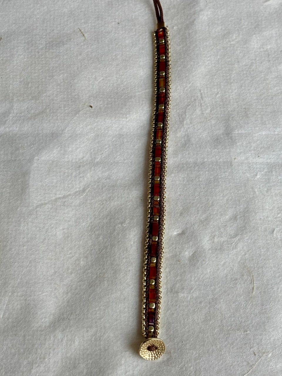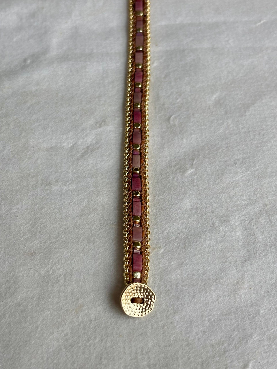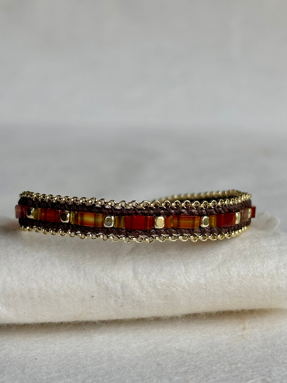 Pulsera elaborada a mano en Tailandia, con un diseño contemporáneo y elegante que combina una fila central de piedras naturales y cuentas de cristal, acompañadas de pequeños detalles metálicos, cuidadosamente entrelazadas sobre cordón trenzado. El conjunto se enmarca con una fina cadena metálica decorativa que aporta estructura y un acabado sofisticado. Incorpora un cierre ajustable mediante nudos corredizos, que permite adaptarse cómodamente a diferentes tallas de muñeca.