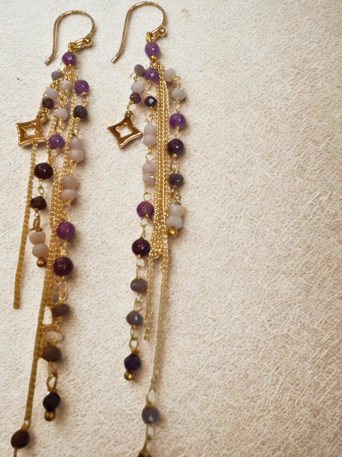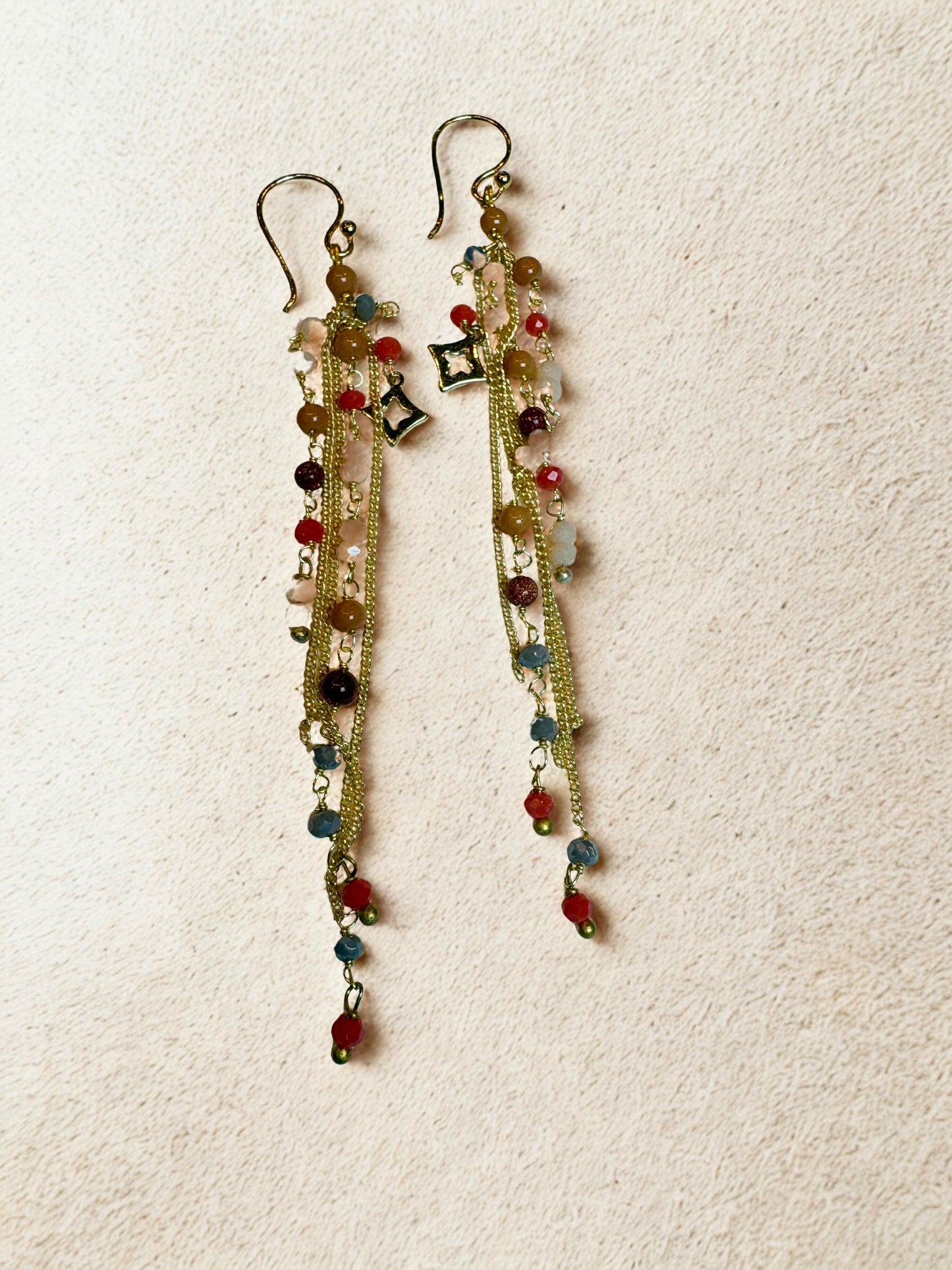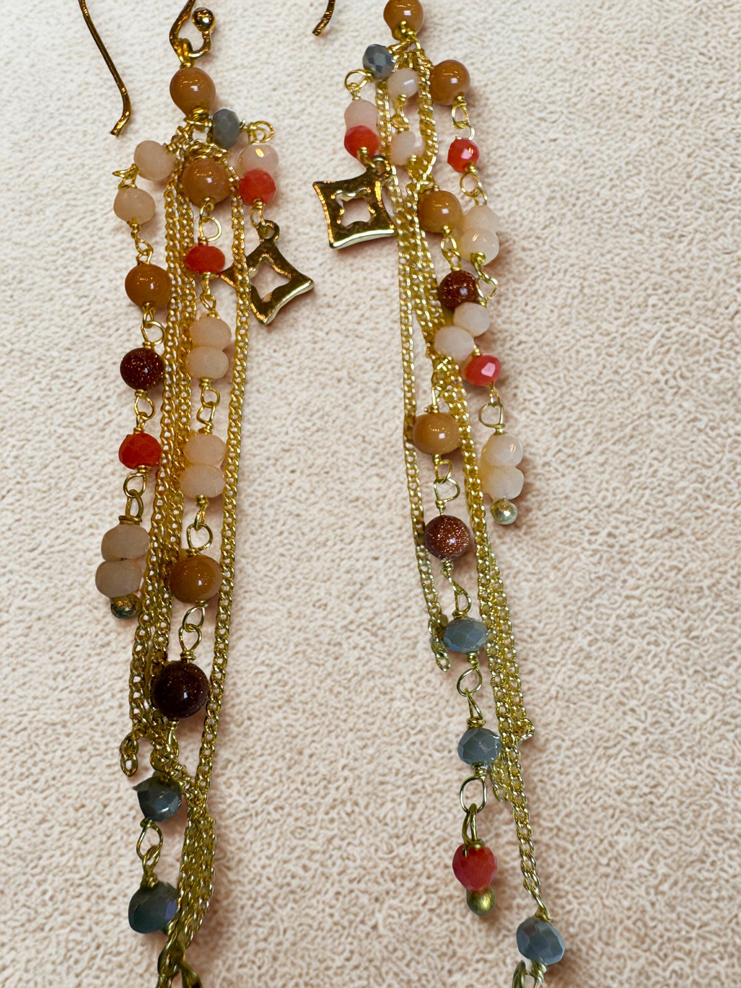 Ligeros, con movimiento y llenos de matices. Estos pendientes combinan delicadas cadenas bañadas en oro con una mezcla de cuentas en tonos suaves y cálidos. El pequeño detalle de estrellas doradas aporta un guiño especial y luminoso que los hace aún más únicos.