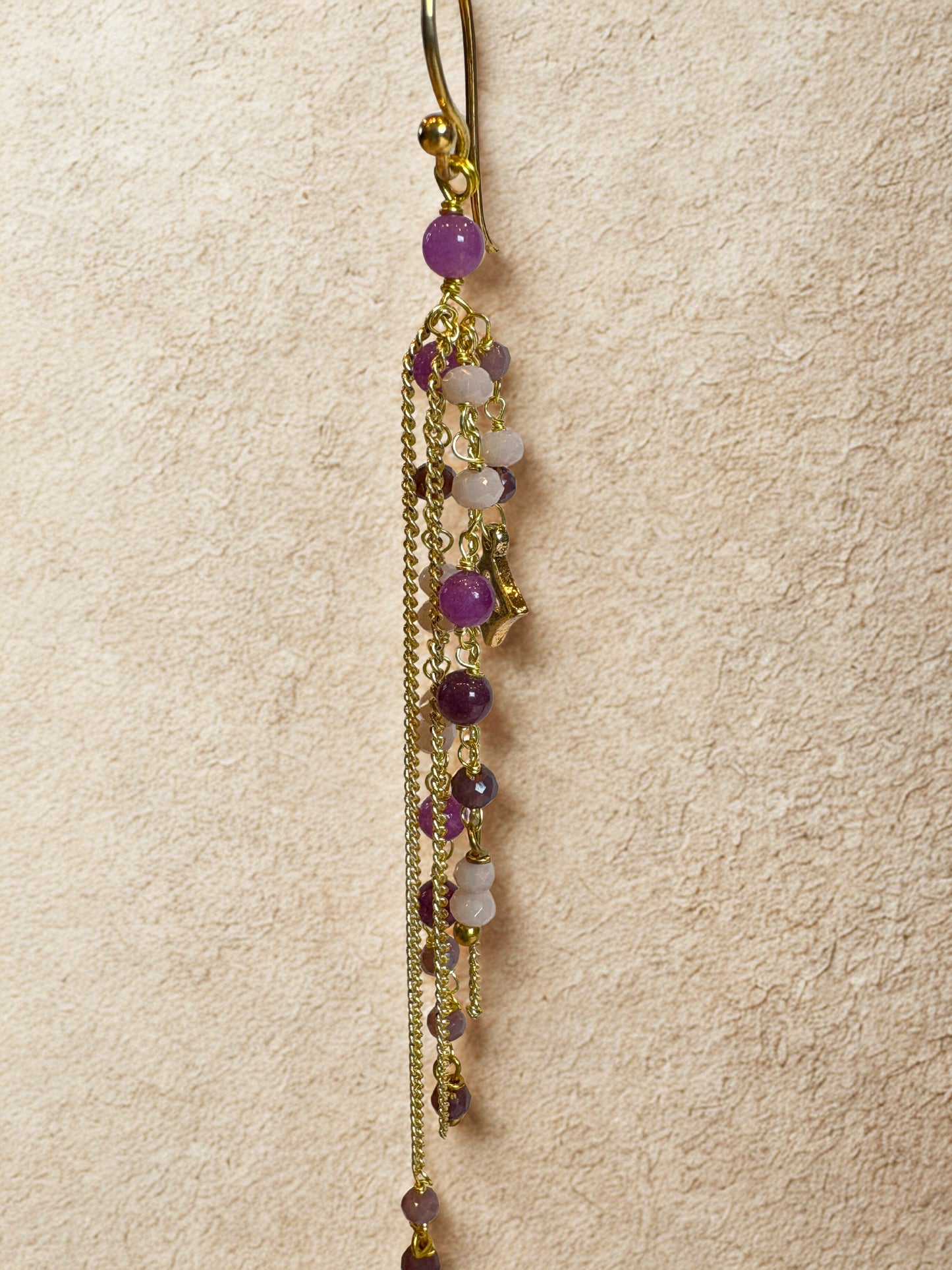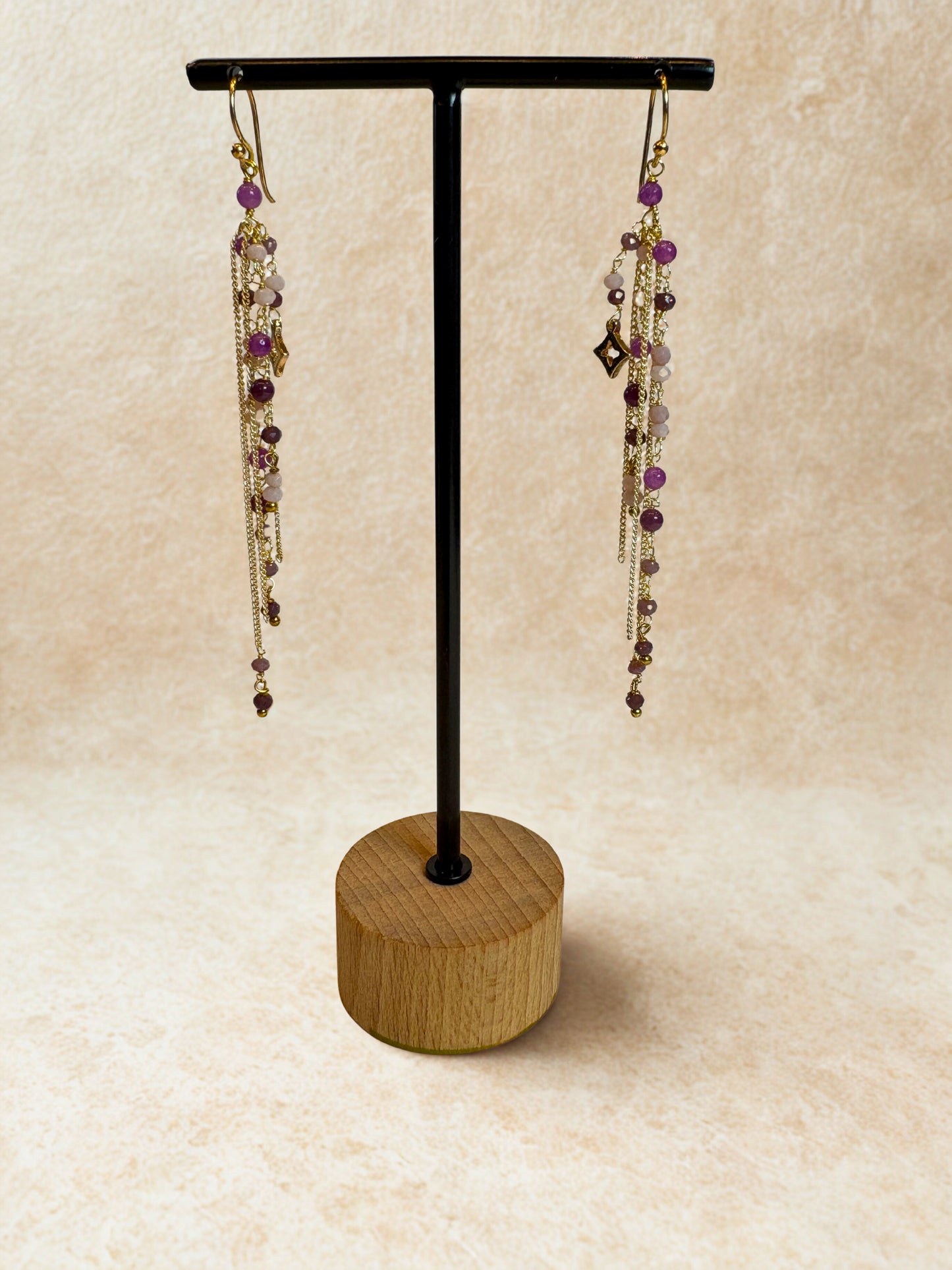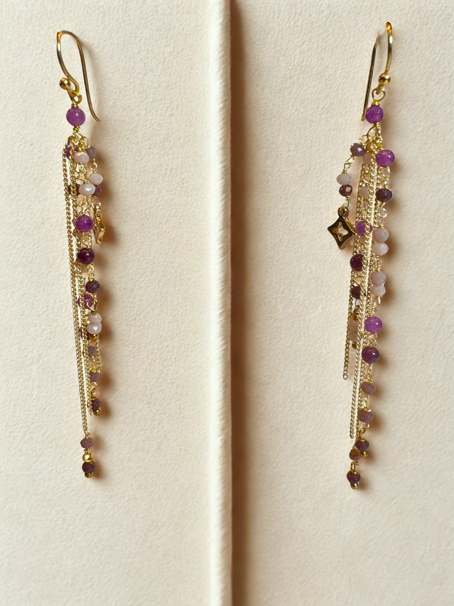 Ligeros, con movimiento y llenos de matices. Estos pendientes combinan delicadas cadenas bañadas en oro con una mezcla de cuentas en tonos suaves y cálidos. El pequeño detalle de estrellas doradas aporta un guiño especial y luminoso que los hace aún más únicos.