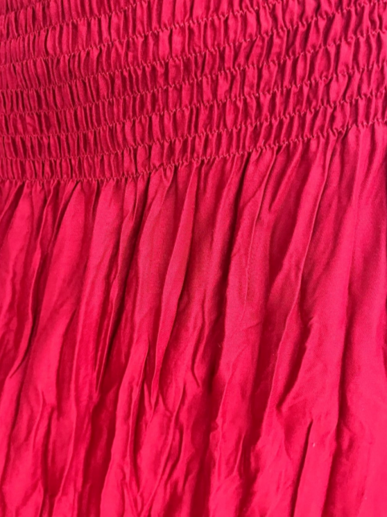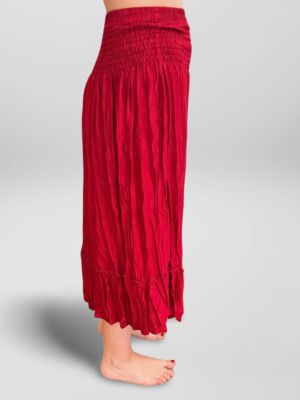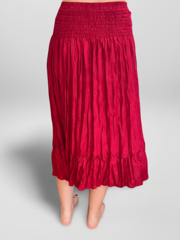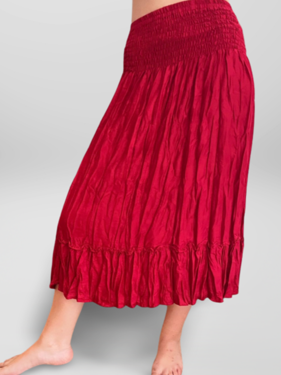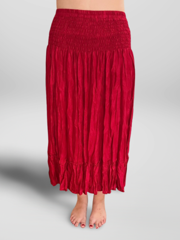 Una falda básica que no pasa desapercibida. Su diseño largo y textura arrugada en color rojo teja la convierten en una prenda versátil, desenfadada, con personalidad, y muy fácil de combinar. La cintura elástica se adapta cómodamente a distintas siluetas, aportando ligereza y movimiento a cada paso.