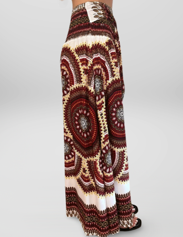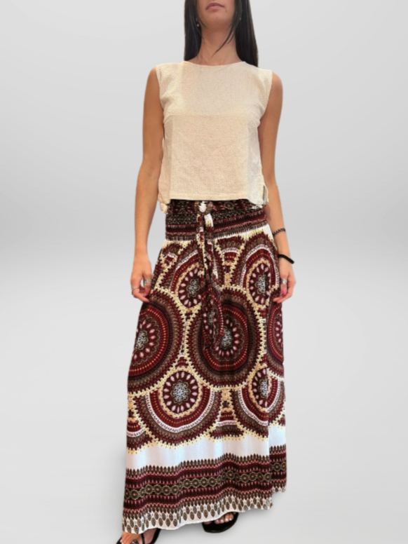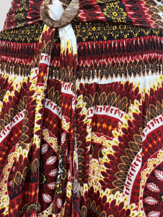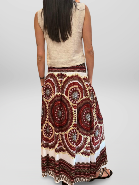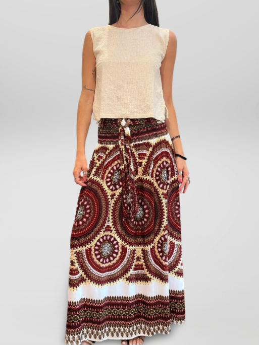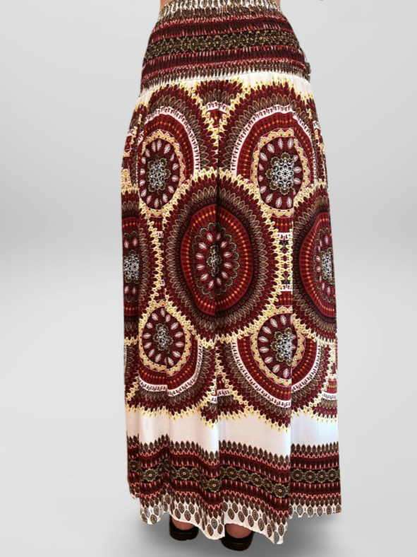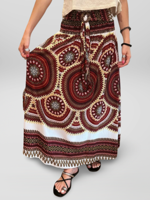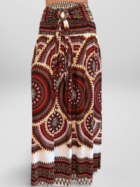 Falda Larga Estilo Boho Cintura Elástica y Hebilla de Coco Granate