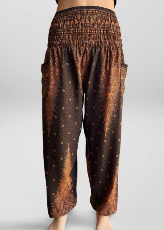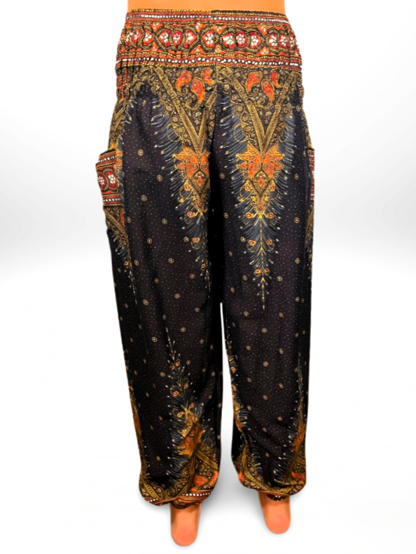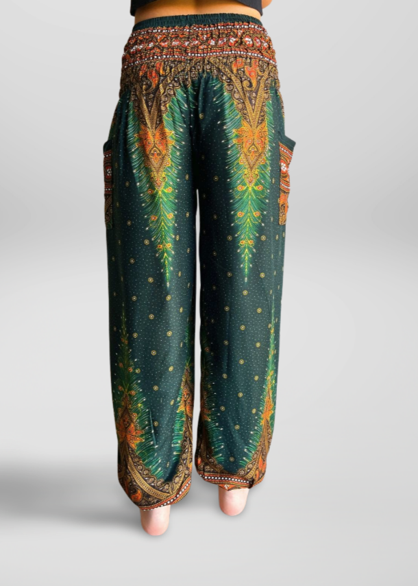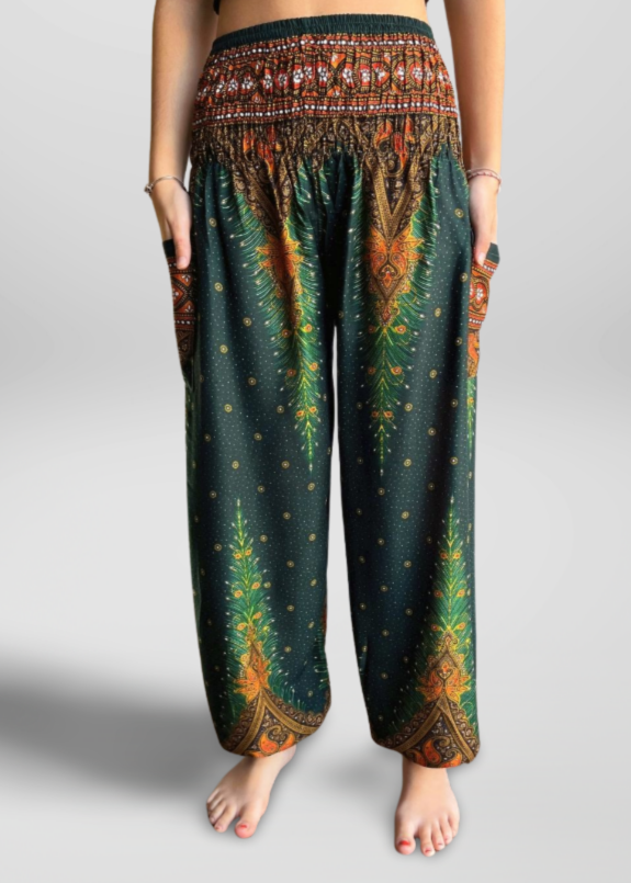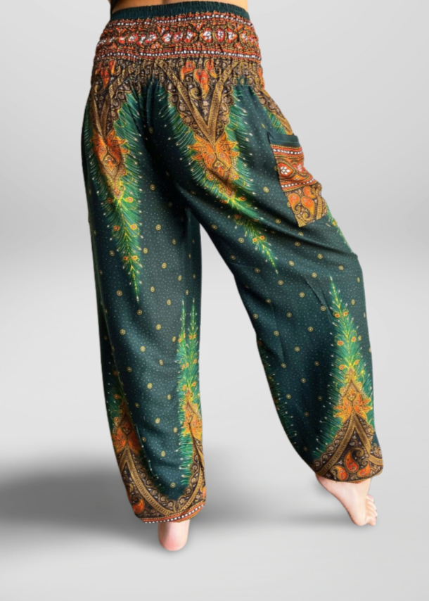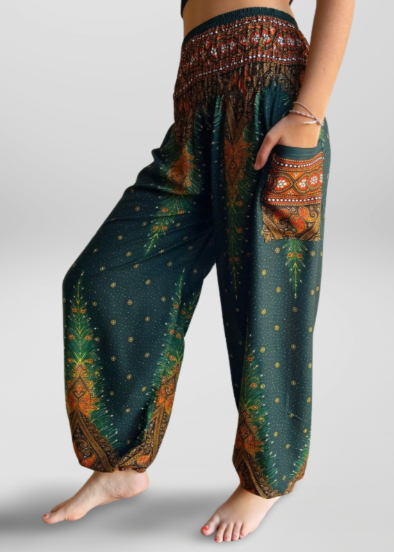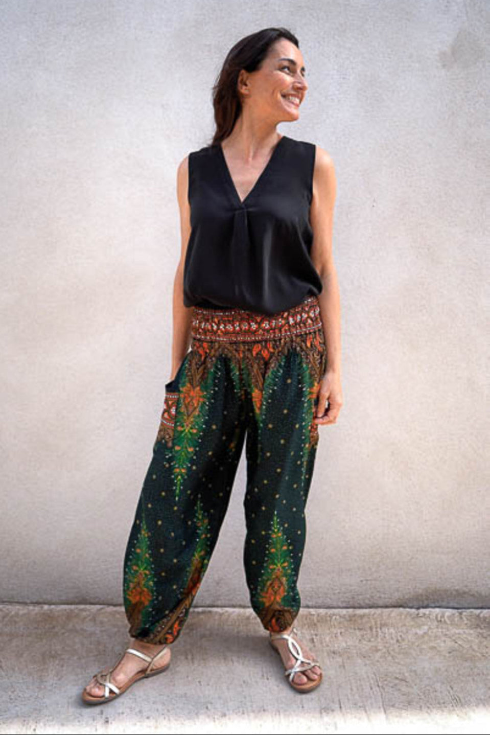 These Thai harem pants with side pockets are the perfect combination of style and functionality. Their design in green and brown tones with decorative details in orange and gold, inspired by traditional Thai patterns, makes them a unique and sophisticated garment.