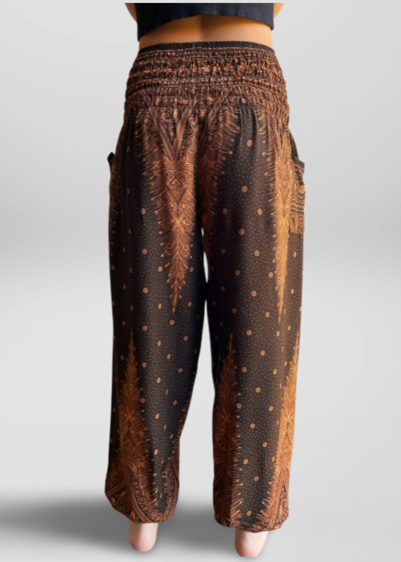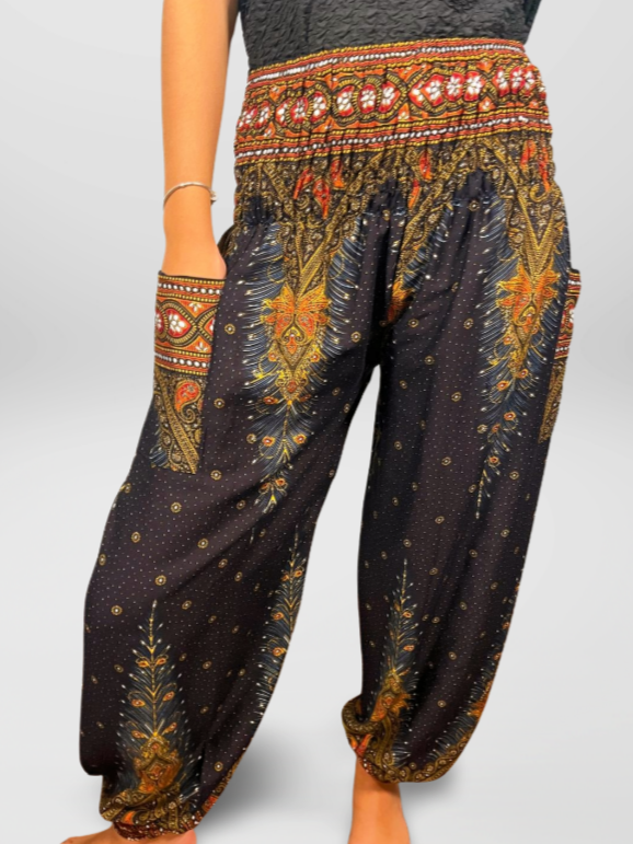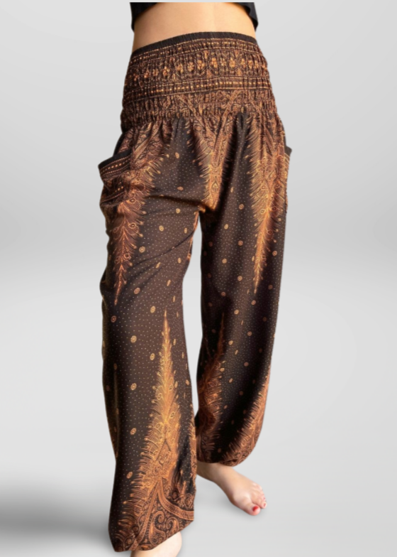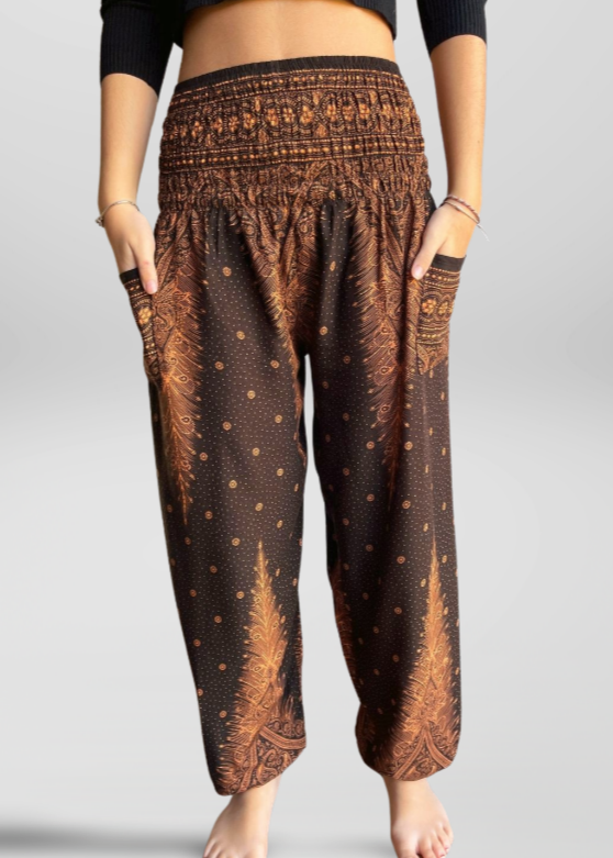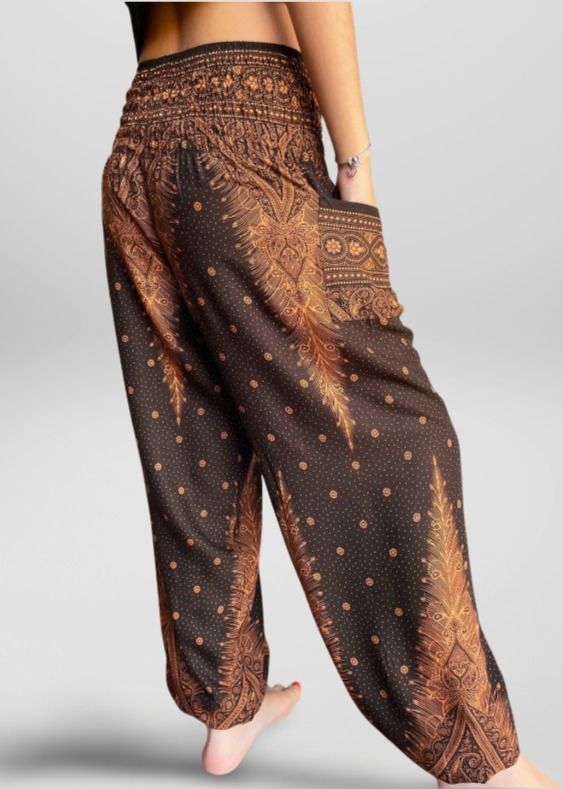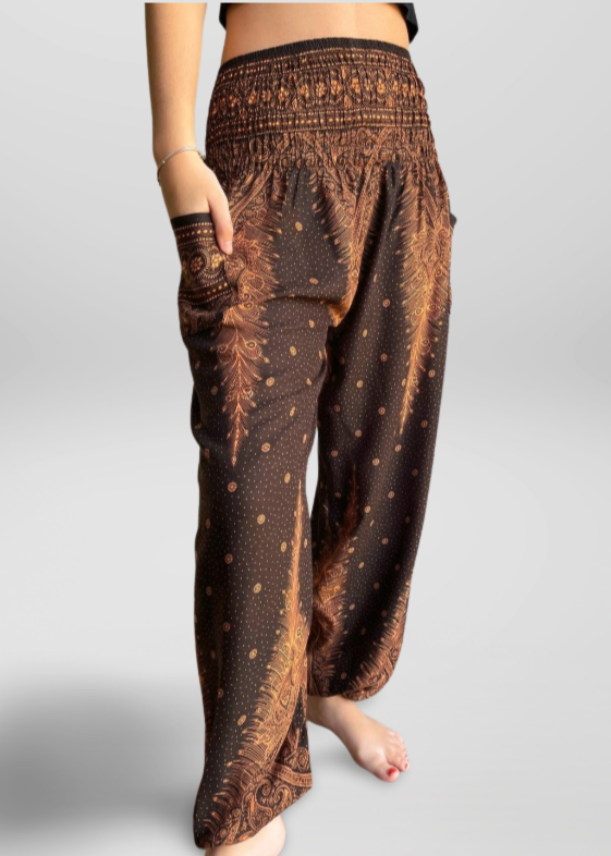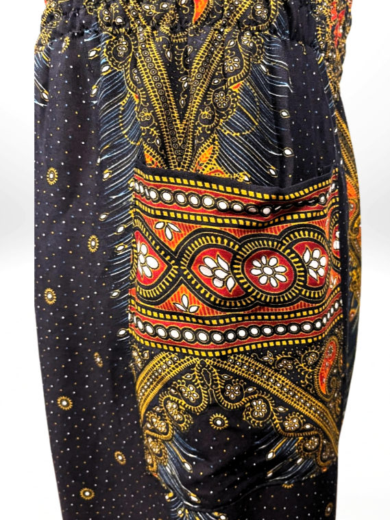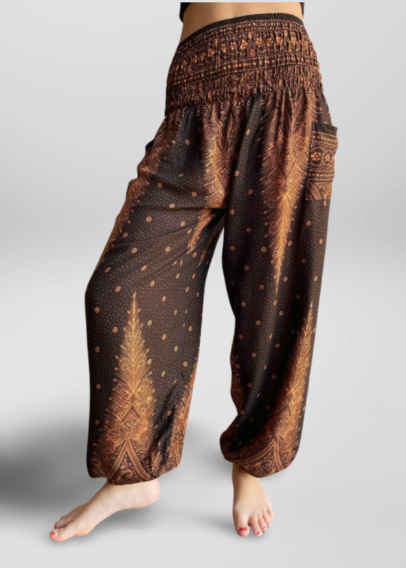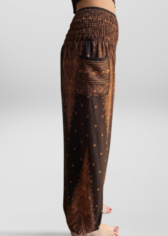 These Thai harem pants with side pockets are the perfect combination of style and functionality. Their design in green and brown tones with decorative details in orange and gold, inspired by traditional Thai patterns, makes them a unique and sophisticated garment.