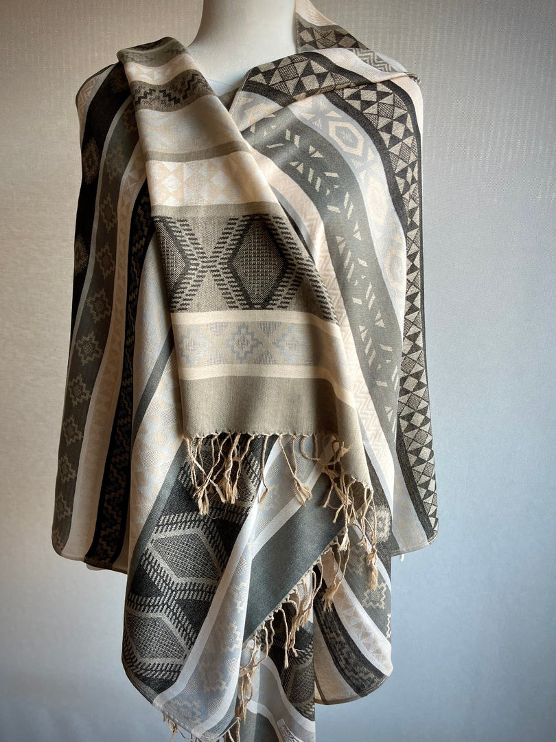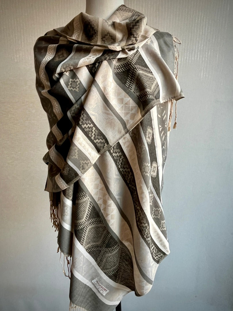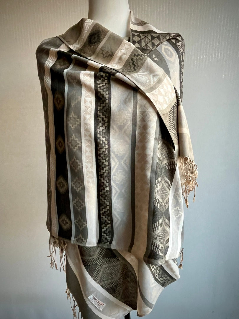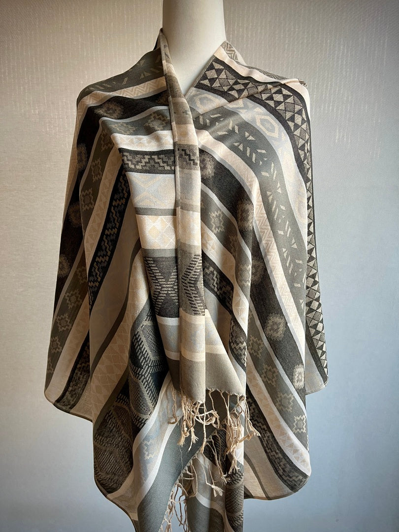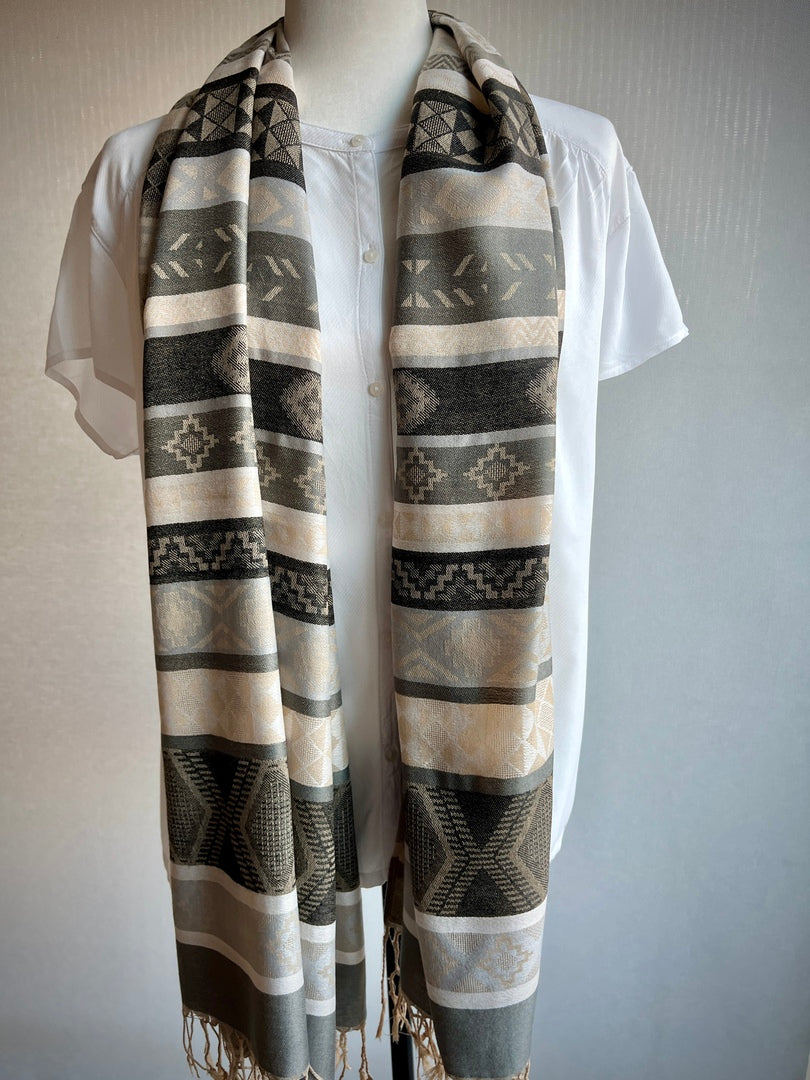 This pashmina features a sober and elegant color combination, with shades of gray, beige, and white blended into traditional geometric patterns. The horizontal stripes and intricate details provide a sophisticated and versatile design, while the natural-toned fringes give it a handcrafted finish.