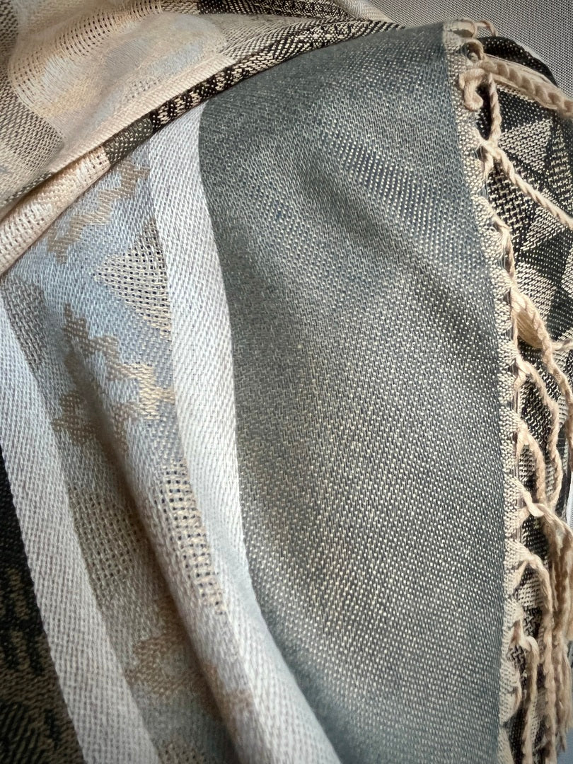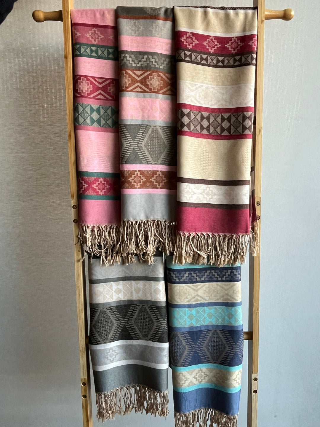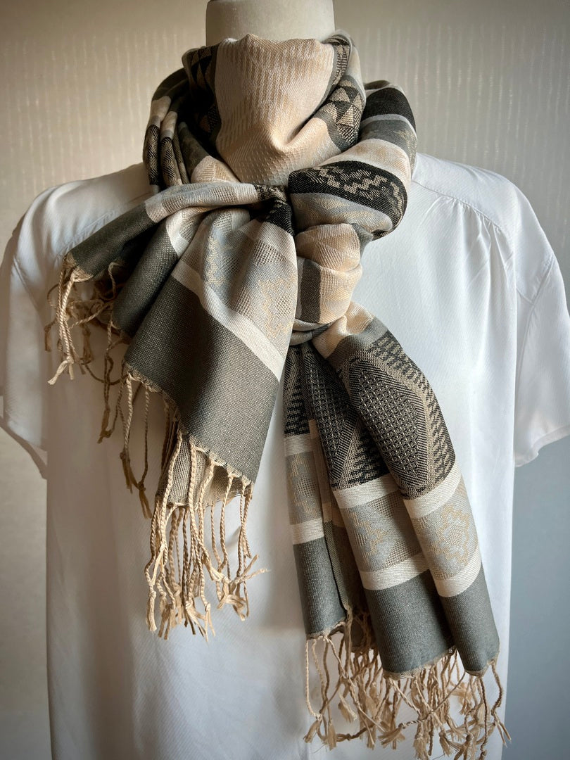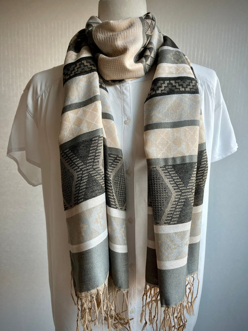 This pashmina features a sober and elegant color combination, with shades of gray, beige, and white blended into traditional geometric patterns. The horizontal stripes and intricate details provide a sophisticated and versatile design, while the natural-toned fringes give it a handcrafted finish.