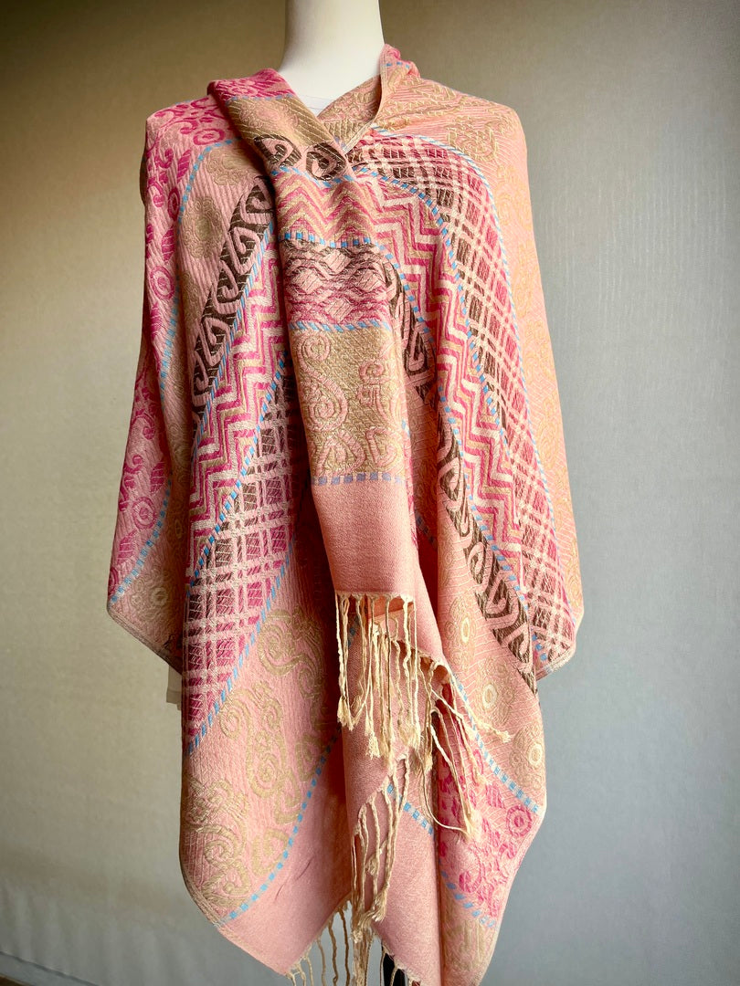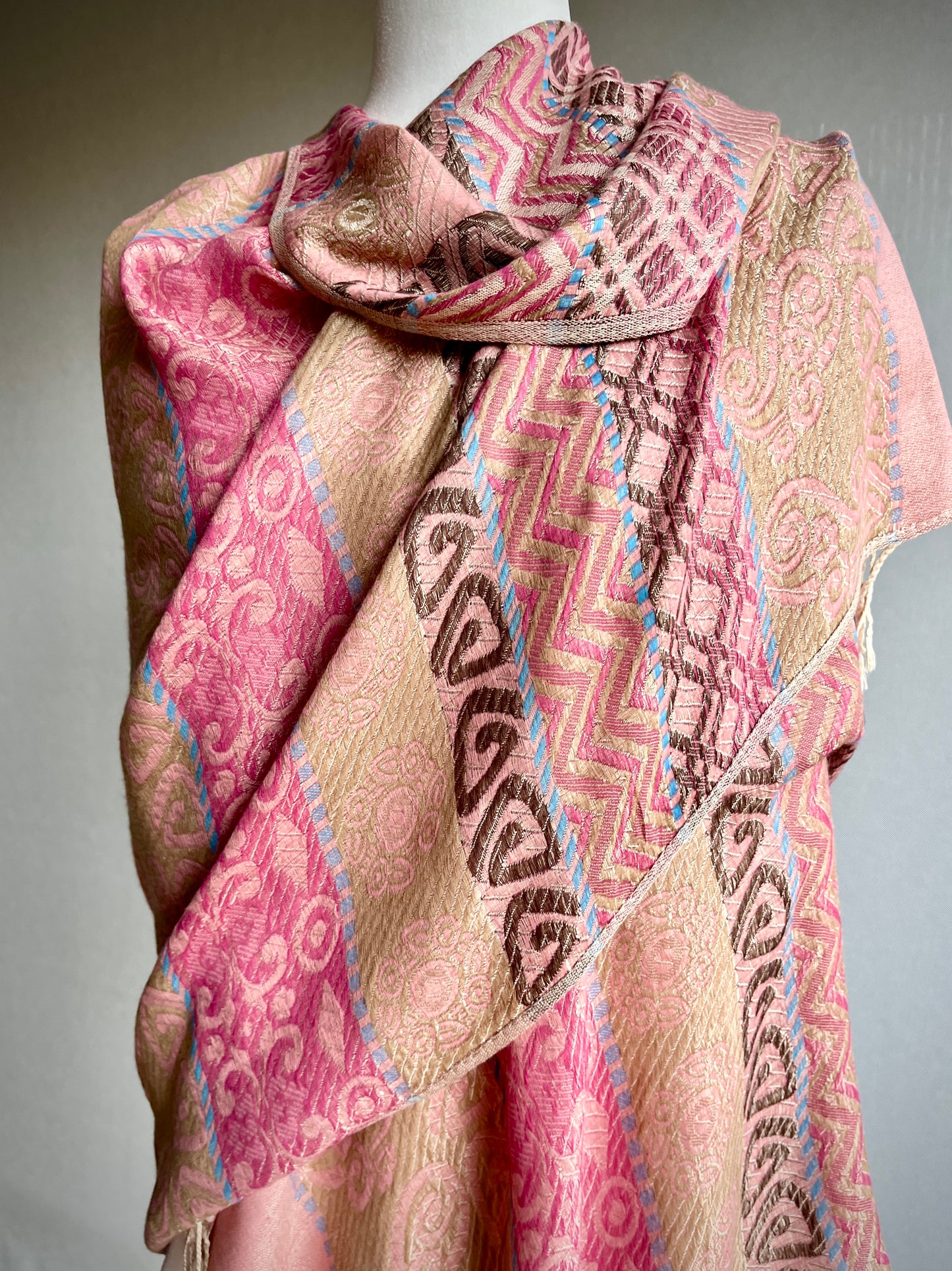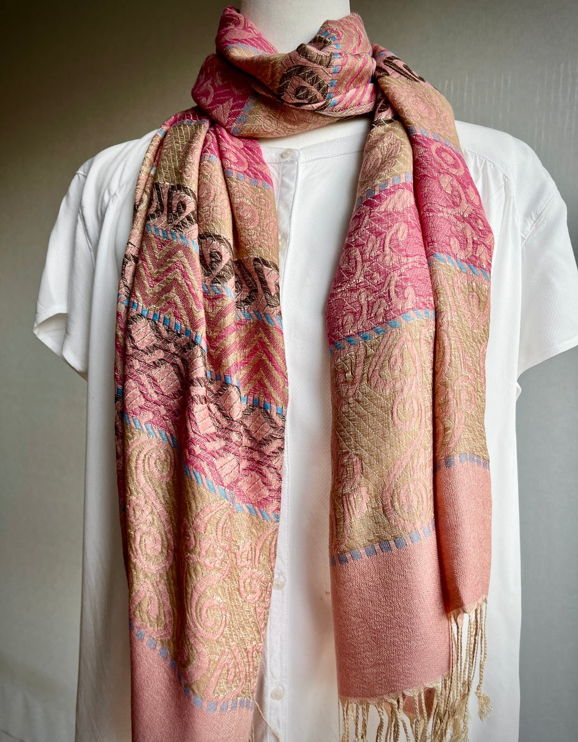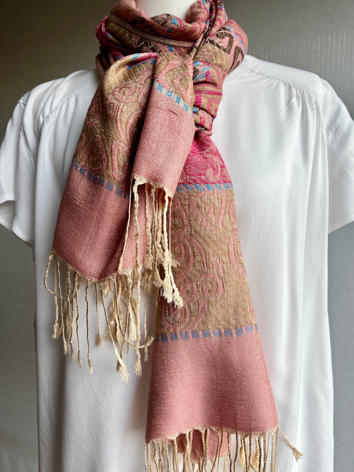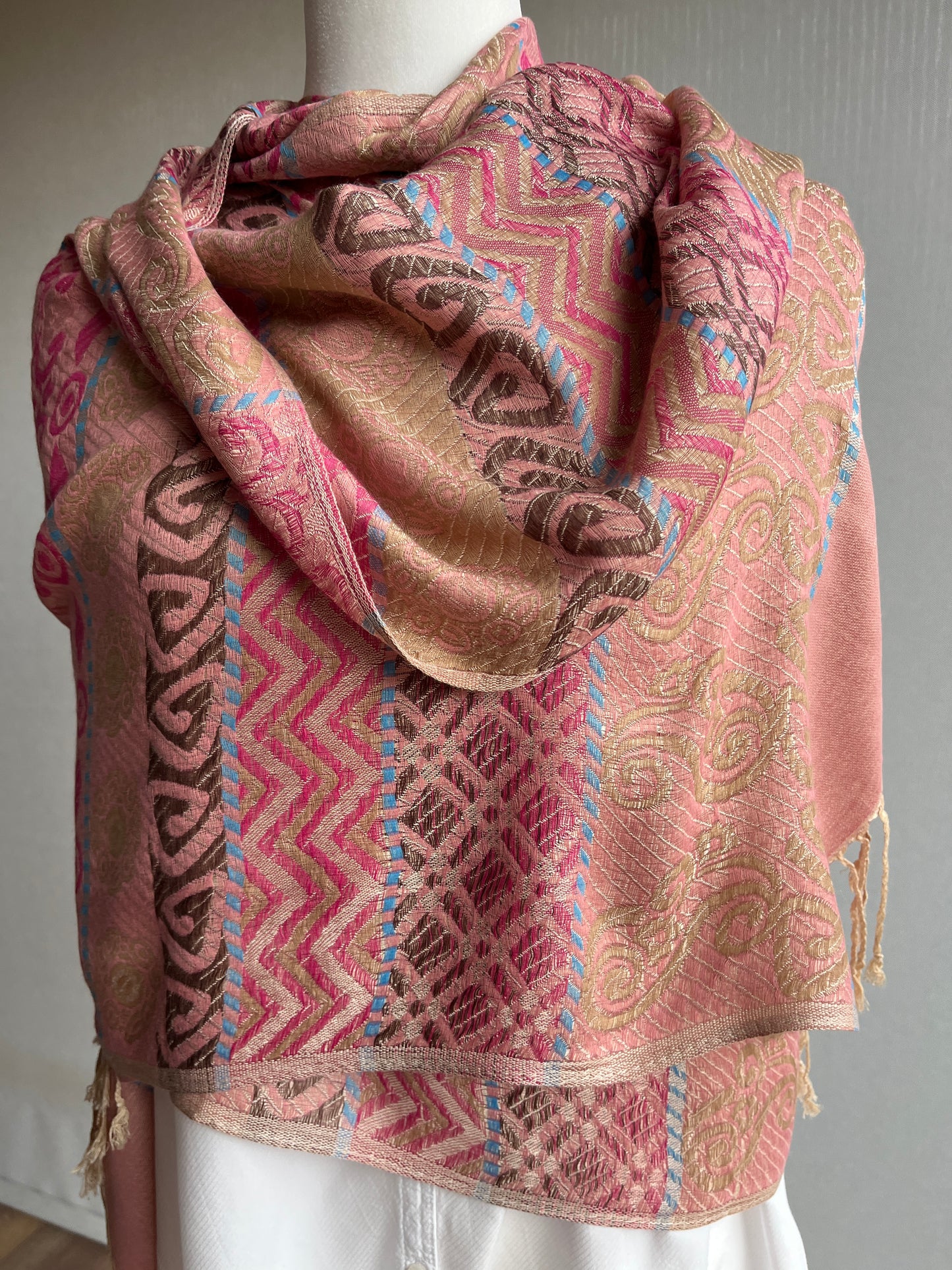 Elegant cashmere pashmina in shades of pink and camel with a traditional Thai geometric design and beige fringes. It stands out for its exceptional softness, style, and versatility, making it an ideal accessory for any season. Its lightweight, breathable fabric provides warmth in winter, while in summer it becomes an accessory that complements without adding heat.