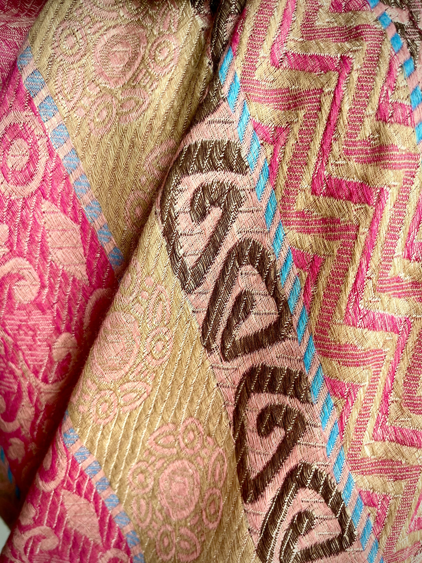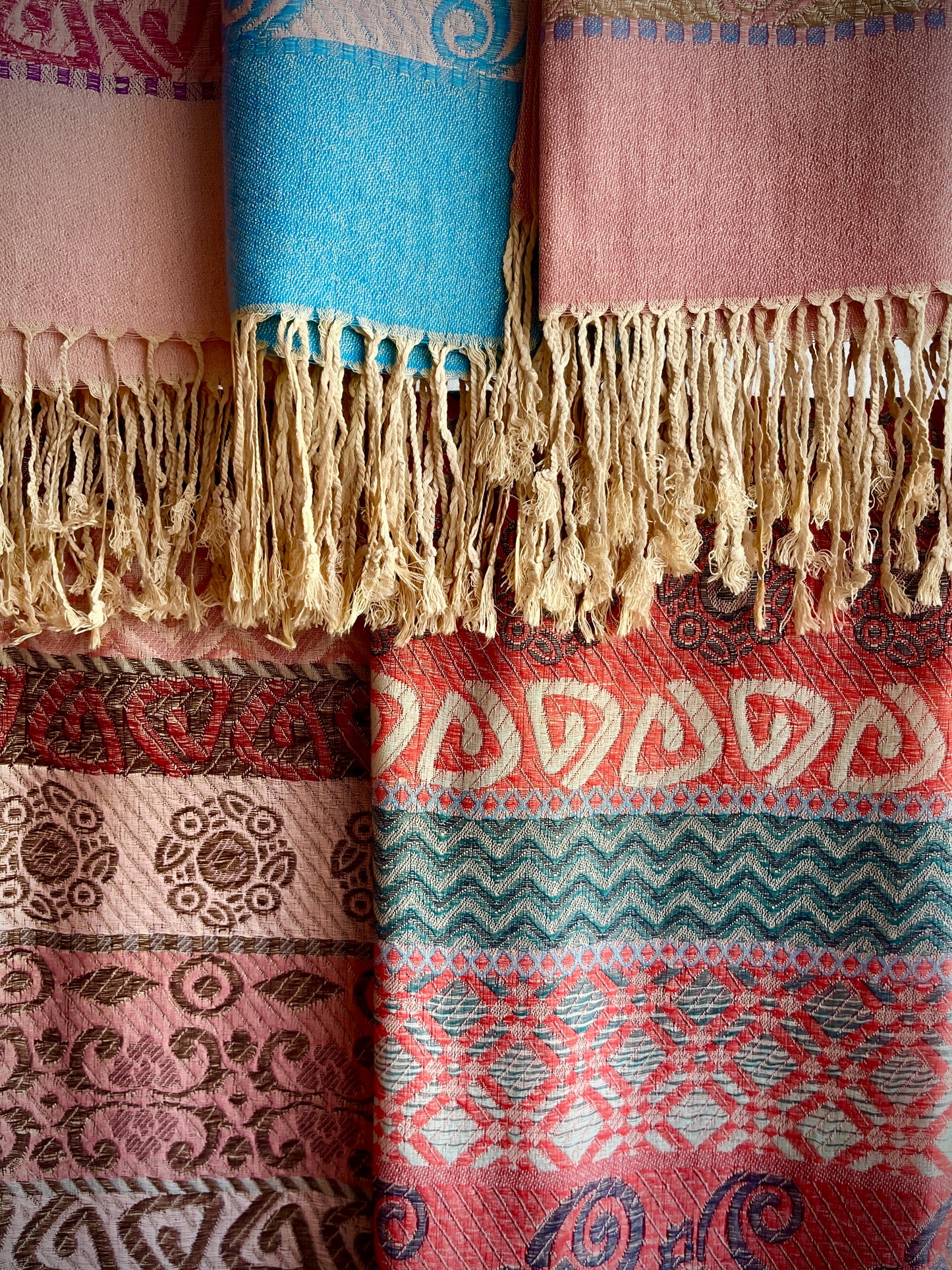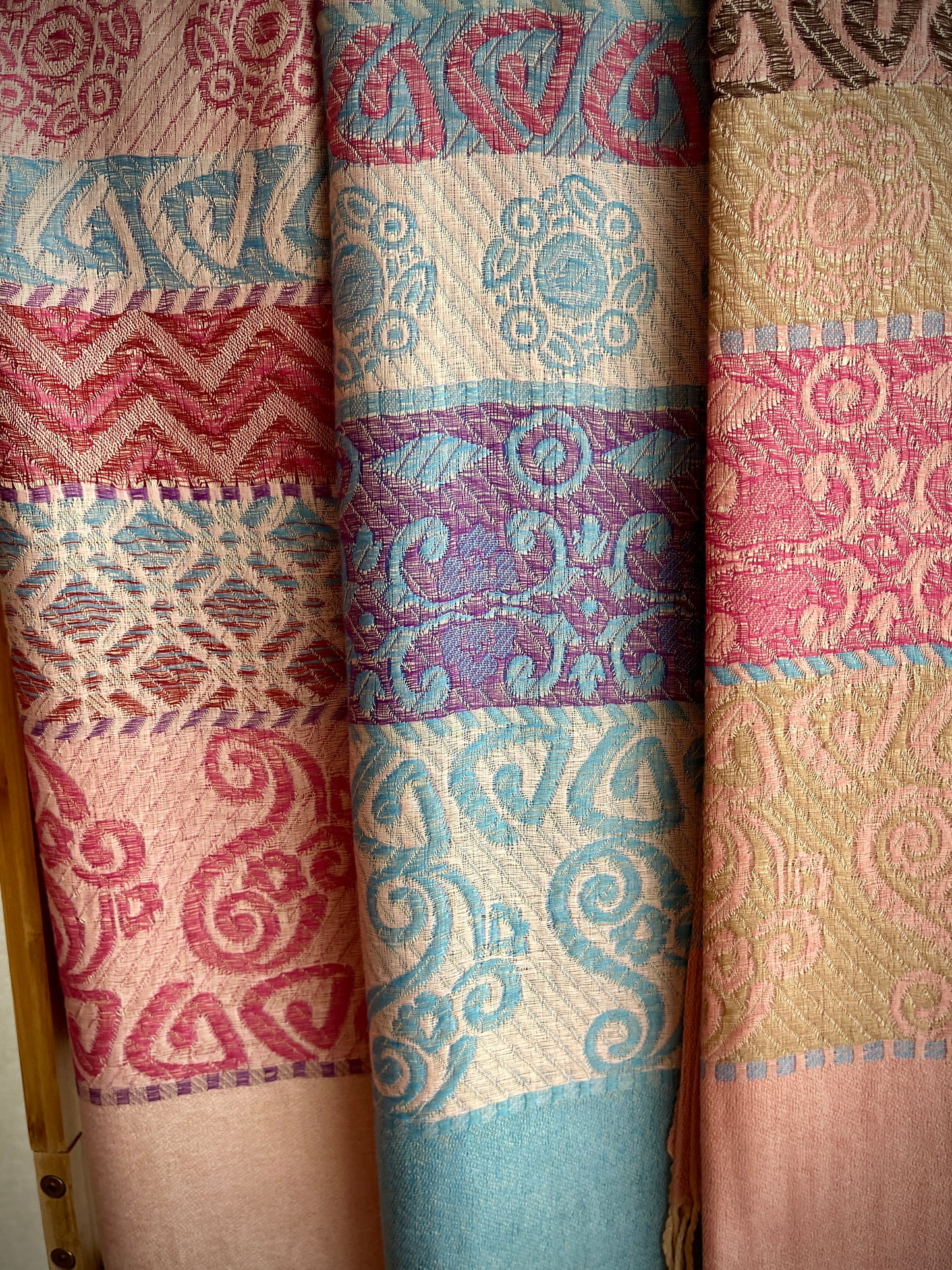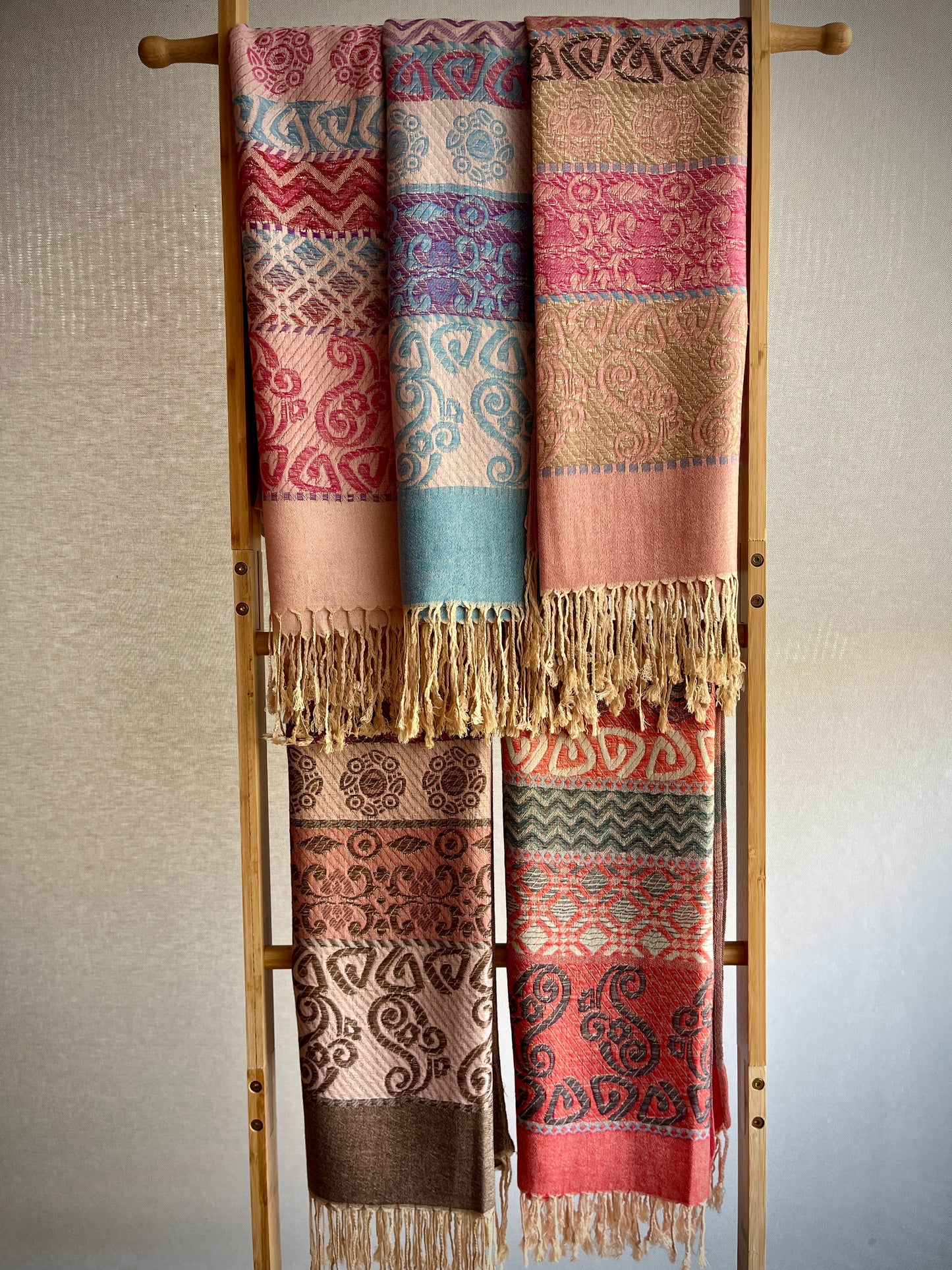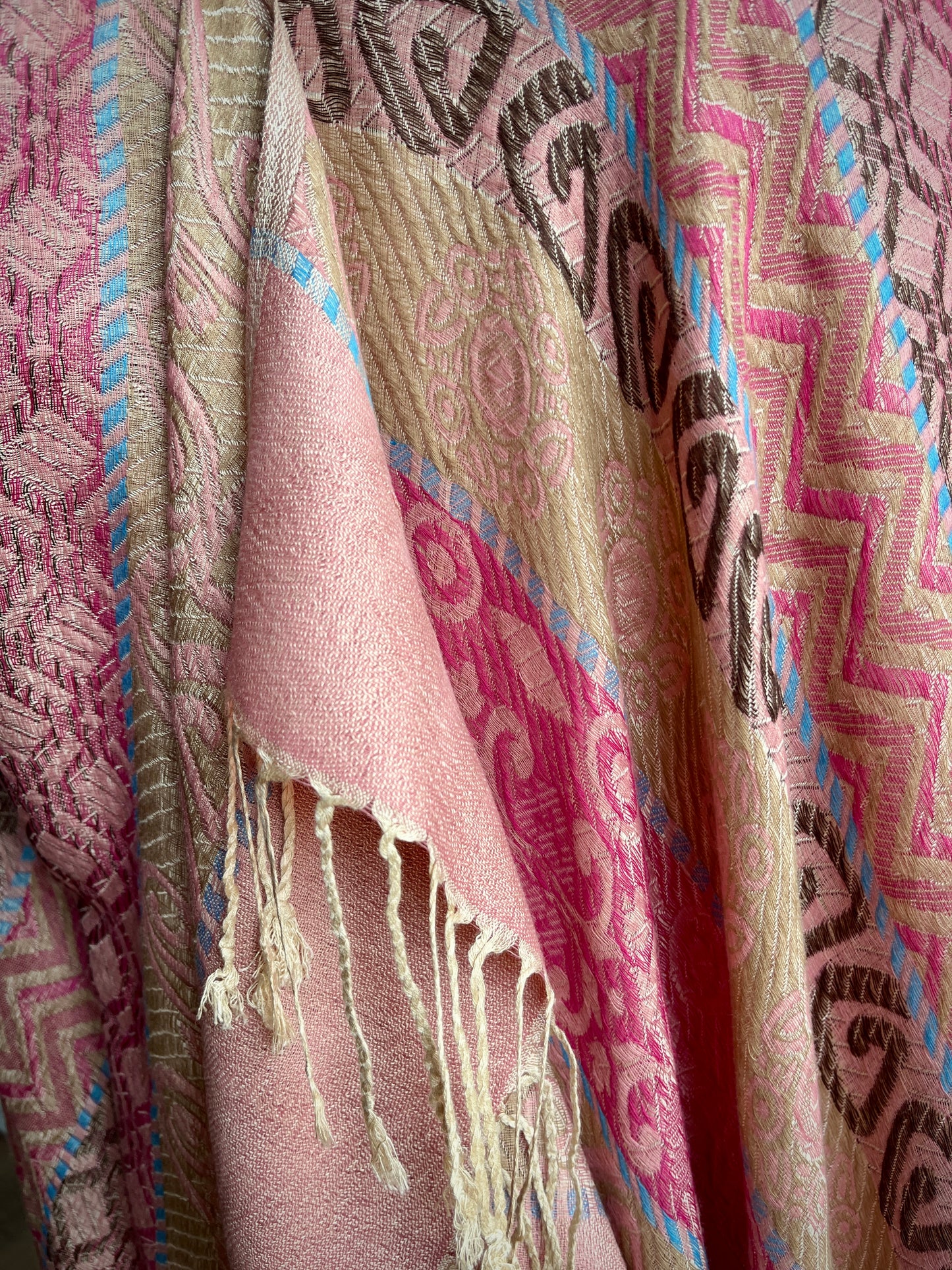 Elegant cashmere pashmina in shades of pink and camel with a traditional Thai geometric design and beige fringes. It stands out for its exceptional softness, style, and versatility, making it an ideal accessory for any season. Its lightweight, breathable fabric provides warmth in winter, while in summer it becomes an accessory that complements without adding heat.