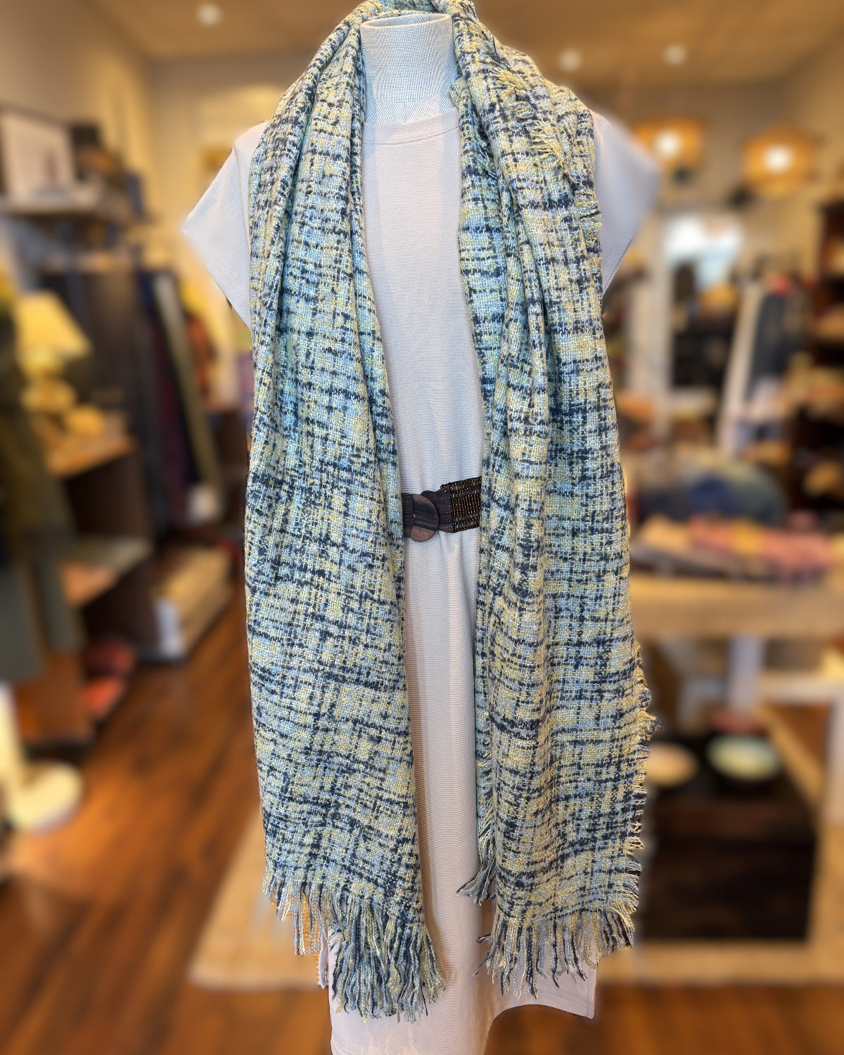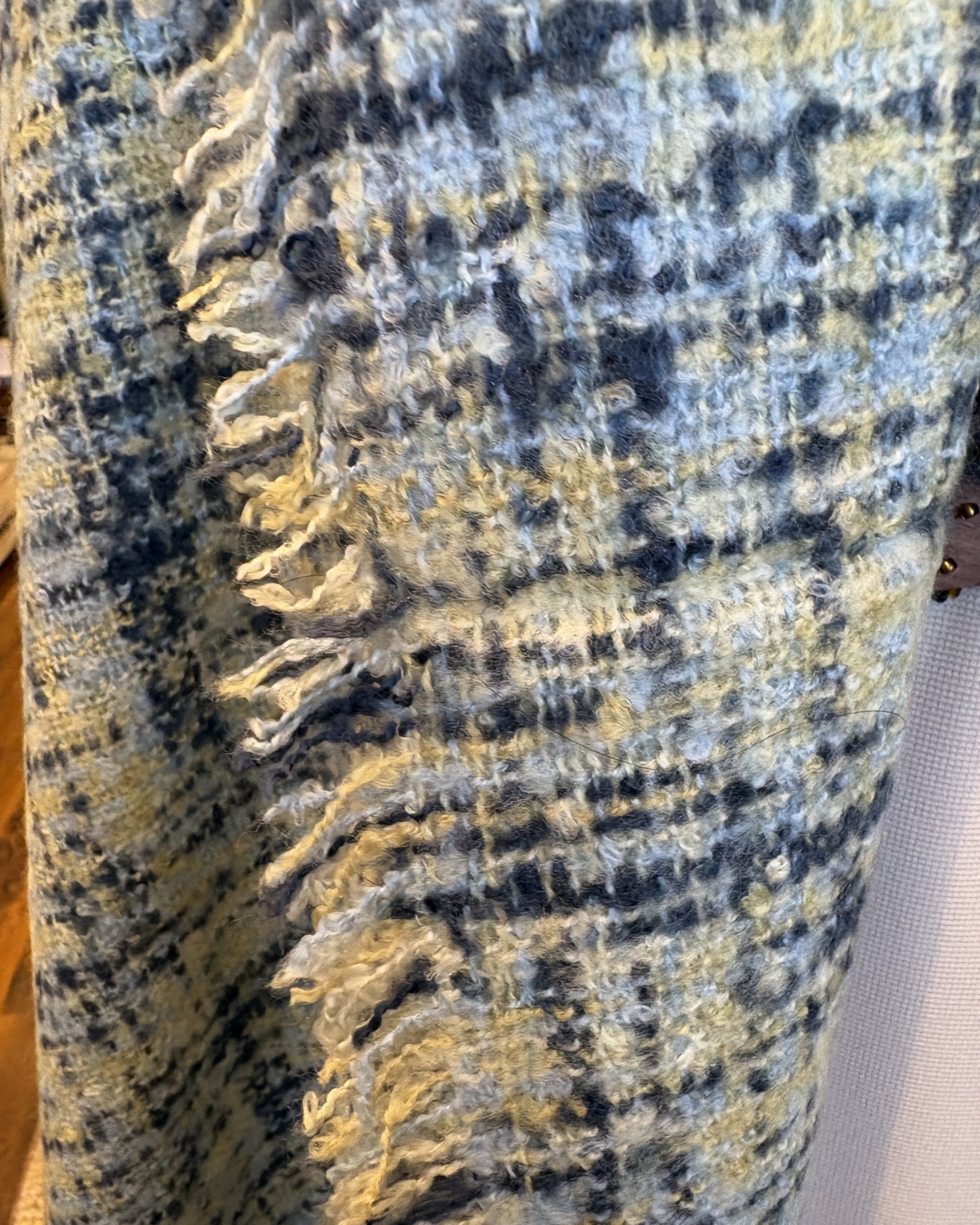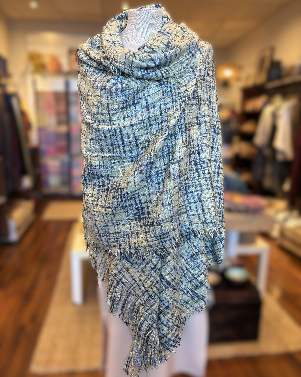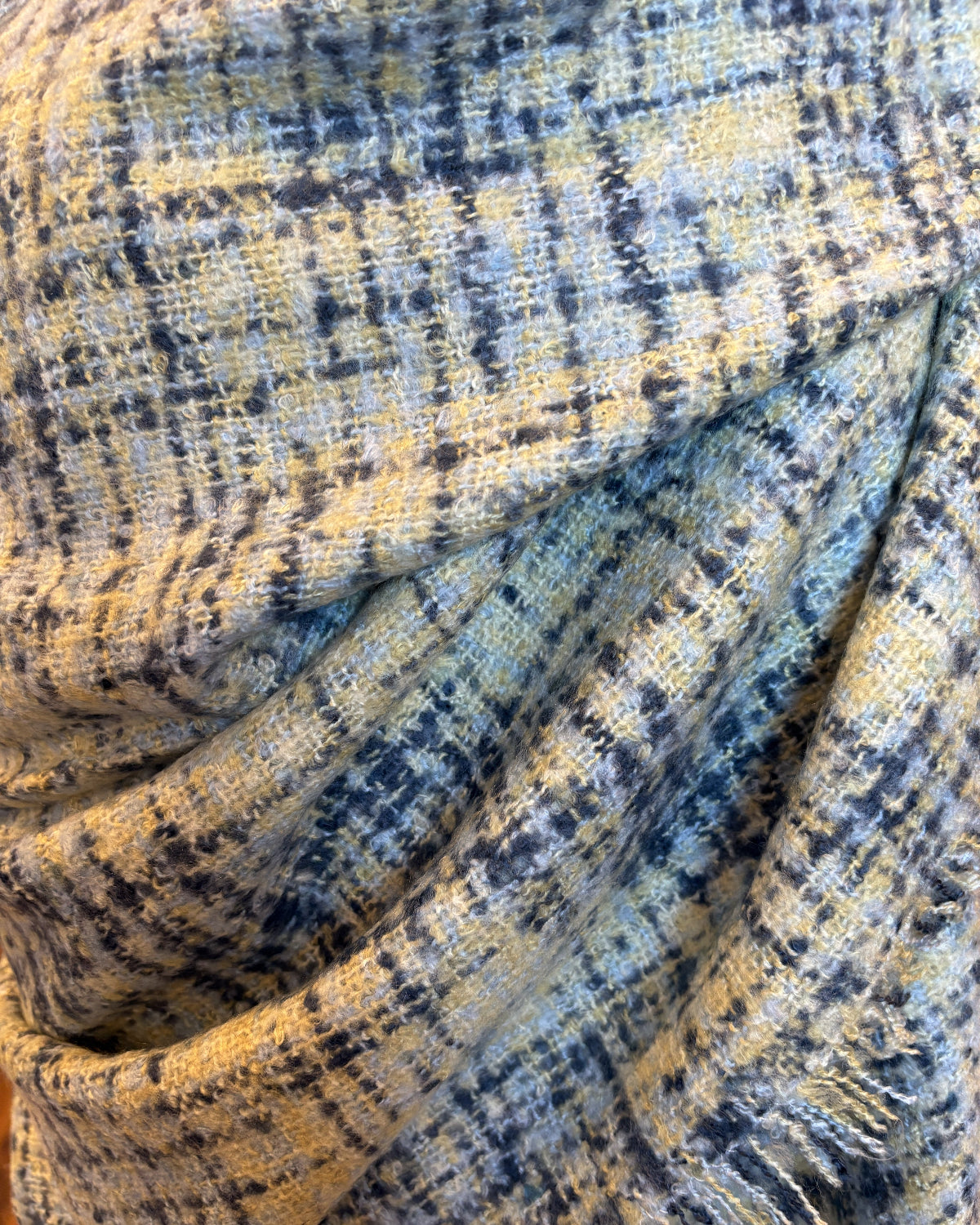 Este chal de cashmere destaca por su suavidad excepcional y su diseño tipo tweed en tonos azules y crudo. Su textura esponjosa y ligera lo convierte en una pieza envolvente y elegante, perfecta para dar calidez y estilo en cualquier ocasión.