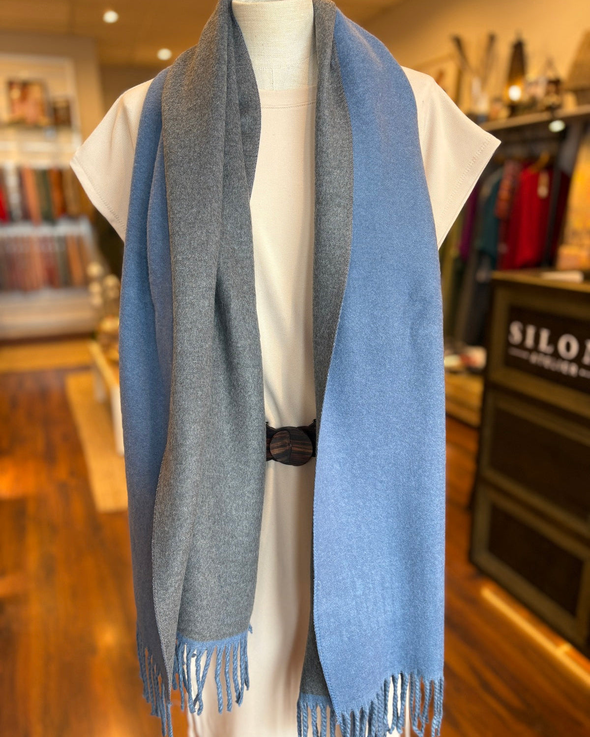 Elegante y versátil, esta bufanda bicolor confeccionada en Tailandia combina estilo, suavidad y calidez. Totalmente reversible, presenta una armoniosa combinación de verde azul vivo y gris tono medio que aporta un toque de sofisticación y luz a cualquier look. Su tacto extremadamente suave y su caída ligera la convierten en el accesorio perfecto para los meses fríos.