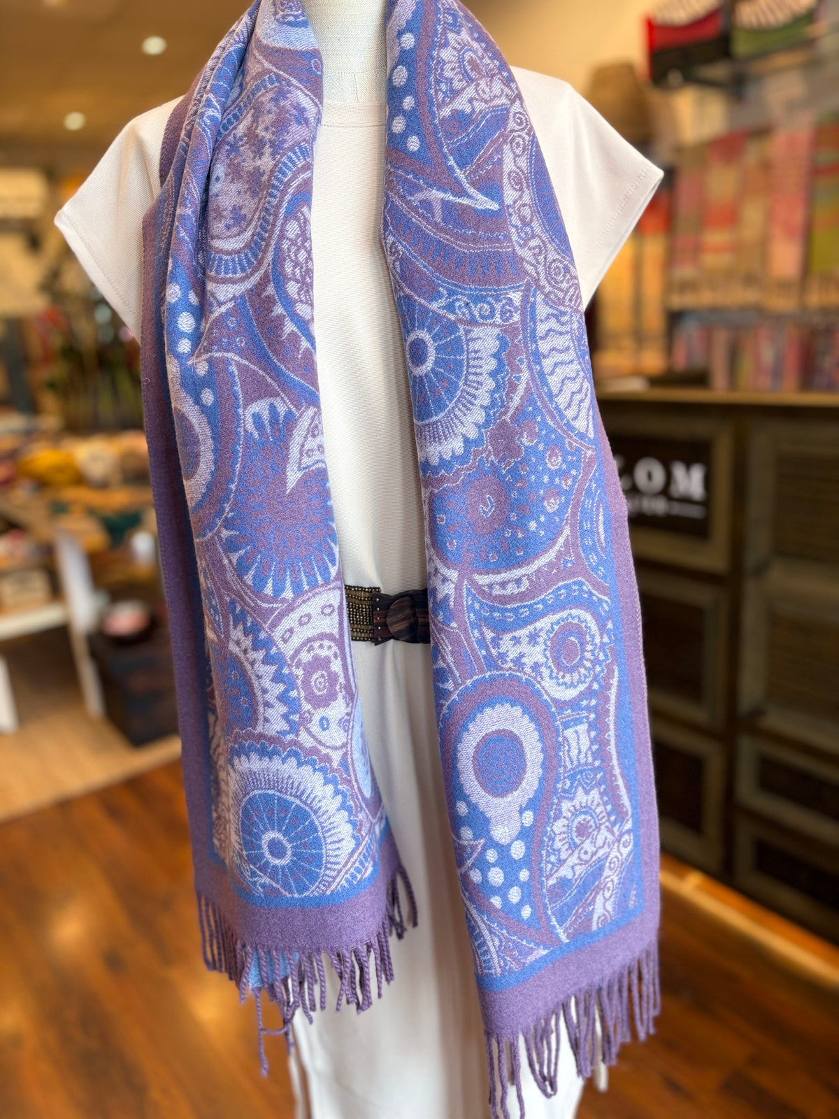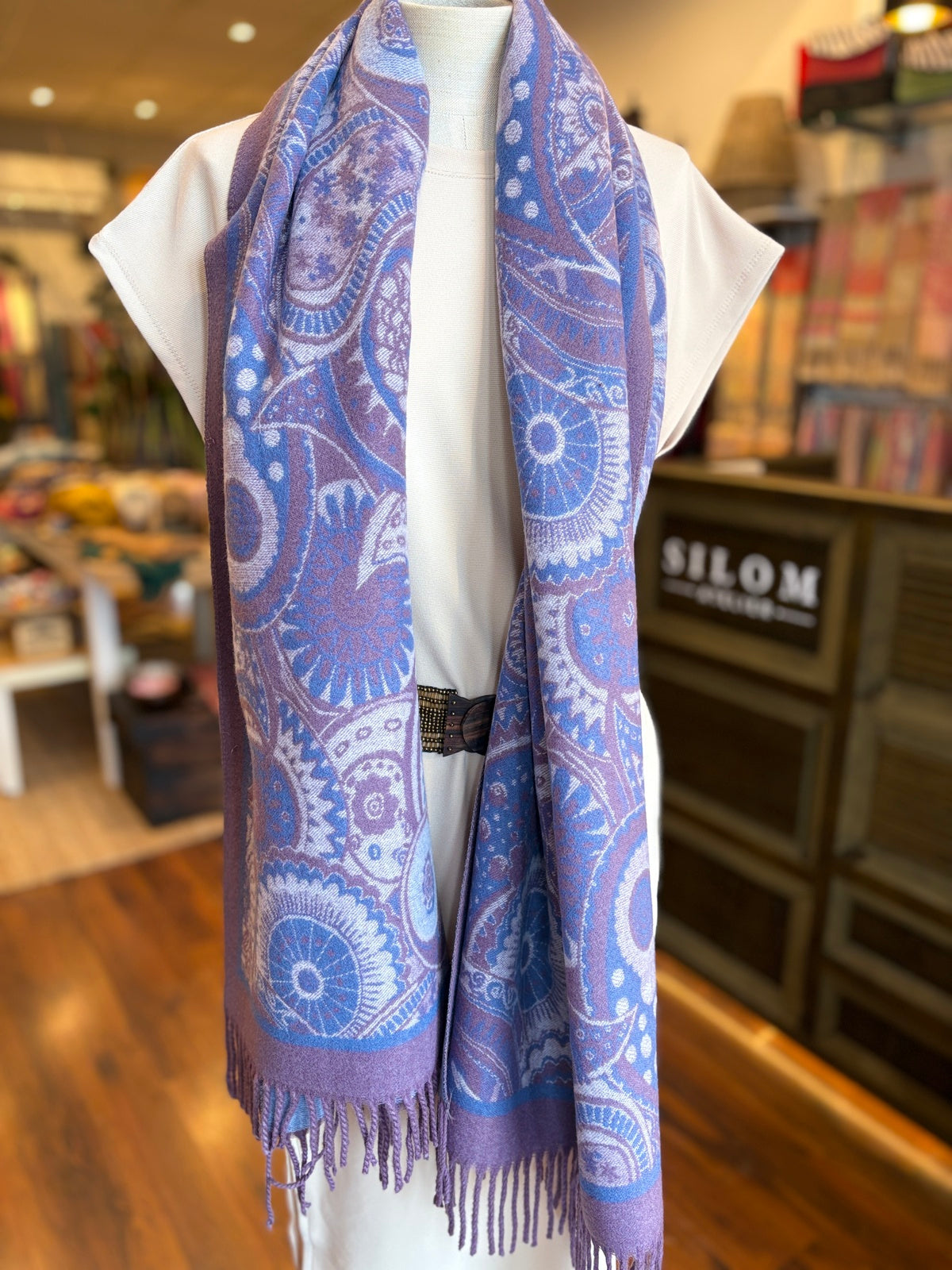 El dibujo paisley ofrece un atractivo diseño. Se puede utilizar como bufanda, chal o capa según la ocasión. Los flecos aportan un toque artesanal que realza aún más su carácter especial.